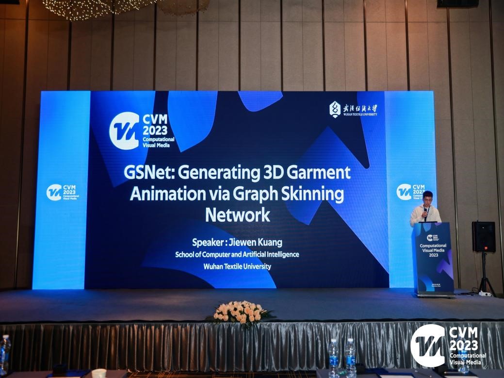 会上,彭涛教授指导邝捷文同学完成的论文《GSNet: Generating 3D Garment Animation via Graph Skinning Network》被CVM2023会议接收并受邀做口头报告。