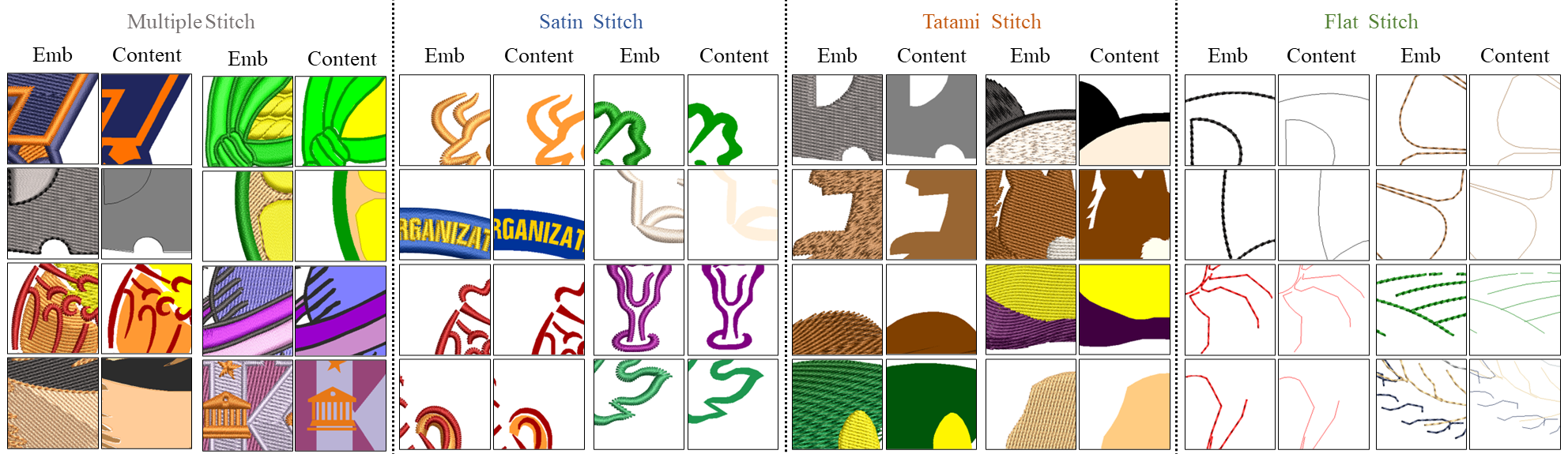 Convolutional neural networks (CNNs) are widely used for embroidery feature synthesis from images. However, they are still unable to predict diverse stitch types, which makes it difficult for the CNNs to effectively extract stitch features. In this paper, we propose a multi-stitch embroidery generative adversarial network (MSEmbGAN) that uses a region-aware texture generation sub-network to predict diverse embroidery features from images. To the best of our knowledge, our work is the first CNN-based generative adversarial network to succeed in this task. Our region-aware texture generation sub-network detects multiple regions in the input image using a stitch classifier and generates a stitch texture for each region based on its shape features. We also propose a structure generation network with a structural feature extractor, which helps achieve full image structural consistency by requiring the shape and color attributes of the output to closely resemble the input image. Because of the current lack of labeled embroidery image datasets, we provide a new multi-stitch embroidery dataset that is annotated with three single-stitch types and one multi-stitch type. Our dataset, which includes more than 30K high-quality multi-stitch embroidery images, more than 13K aligned content-embroidered images, and more than 17K unaligned images, is currently the largest embroidery dataset accessible, as far as we know. Quantitative and qualitative experimental results, including a qualitative user study, show that our MSEmbGAN outperforms current state-of-the-art embroidery synthesis and style-transfer methods on all evaluation indicators.