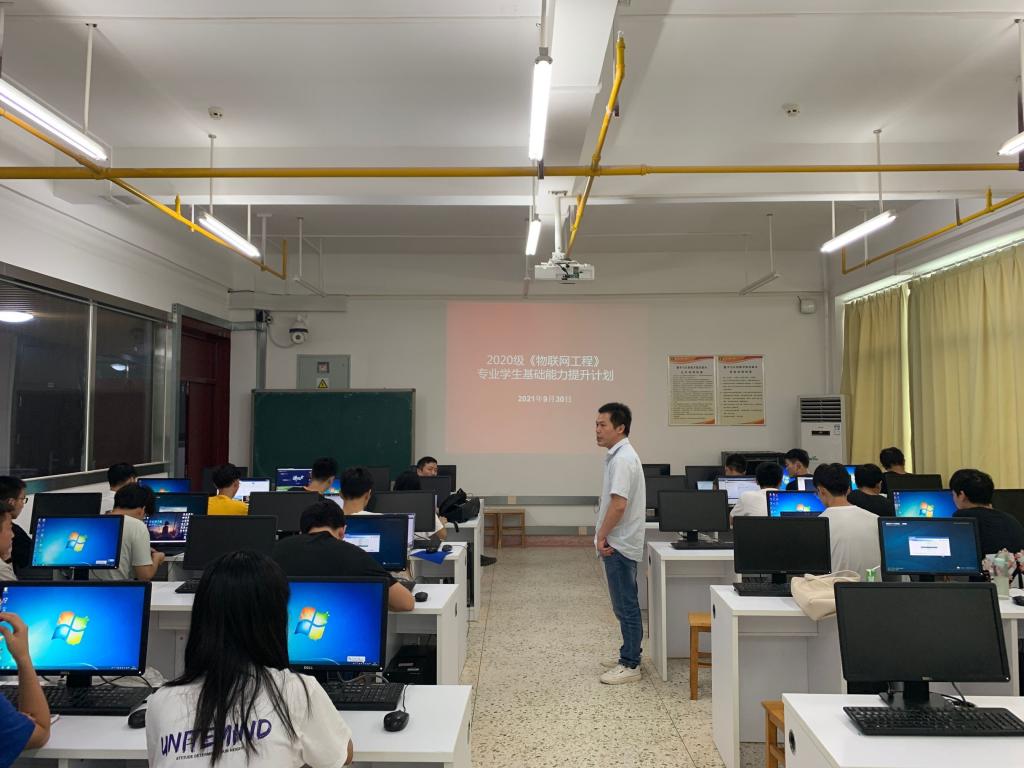 为帮助学生加深对物联网理论基础知识的理解,提高其专业素质水平,男同 物联网工程专业20级学生本学期开展了基础能力提升计划系列为期十周的专业实训活动,20级物联网专业学生在机房进行了物联网相关技术与应用的实践学习。
