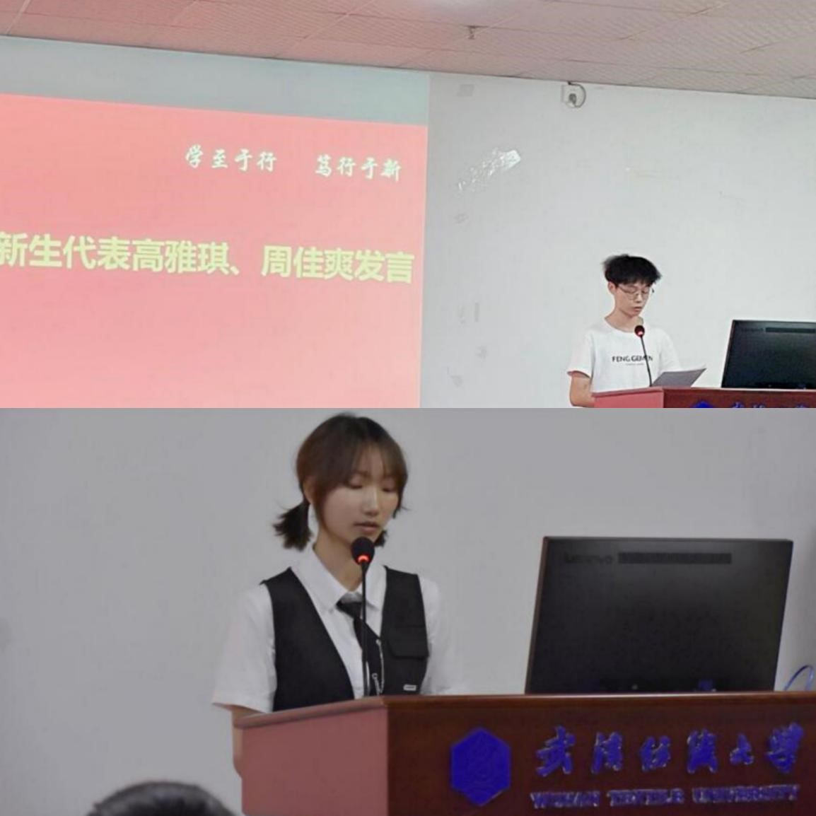 研究生新生代表周佳爽,本科生新生代表高雅琪分别发言,他们的发言表达了对大学学习生活的向往,展现了以实现自身价值为最终目的的毅力,为全院新生树立了榜样。