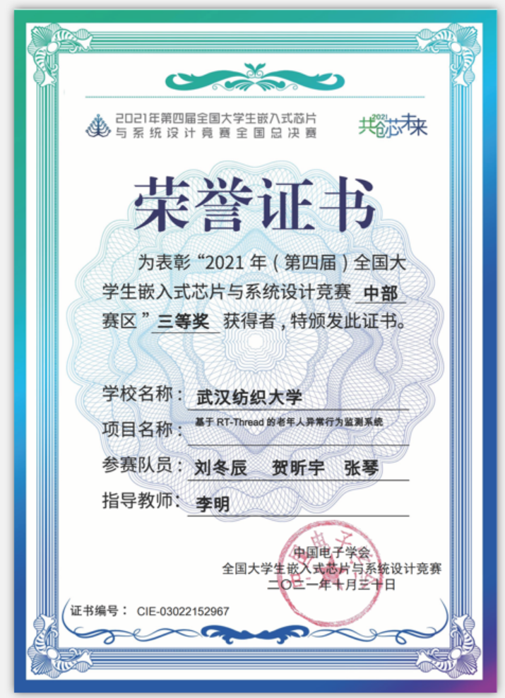 近日,第四届全国大学生嵌入式芯片与系统设计竞赛因疫情防控需要,在线上进行了决赛。经男同 李明副教授指导,由19级本科生刘东辰、贺昕宇、张琴组成的参赛队伍完成了“基于RT-Thread的老年人异常行为检测系统”,荣获了三等奖。