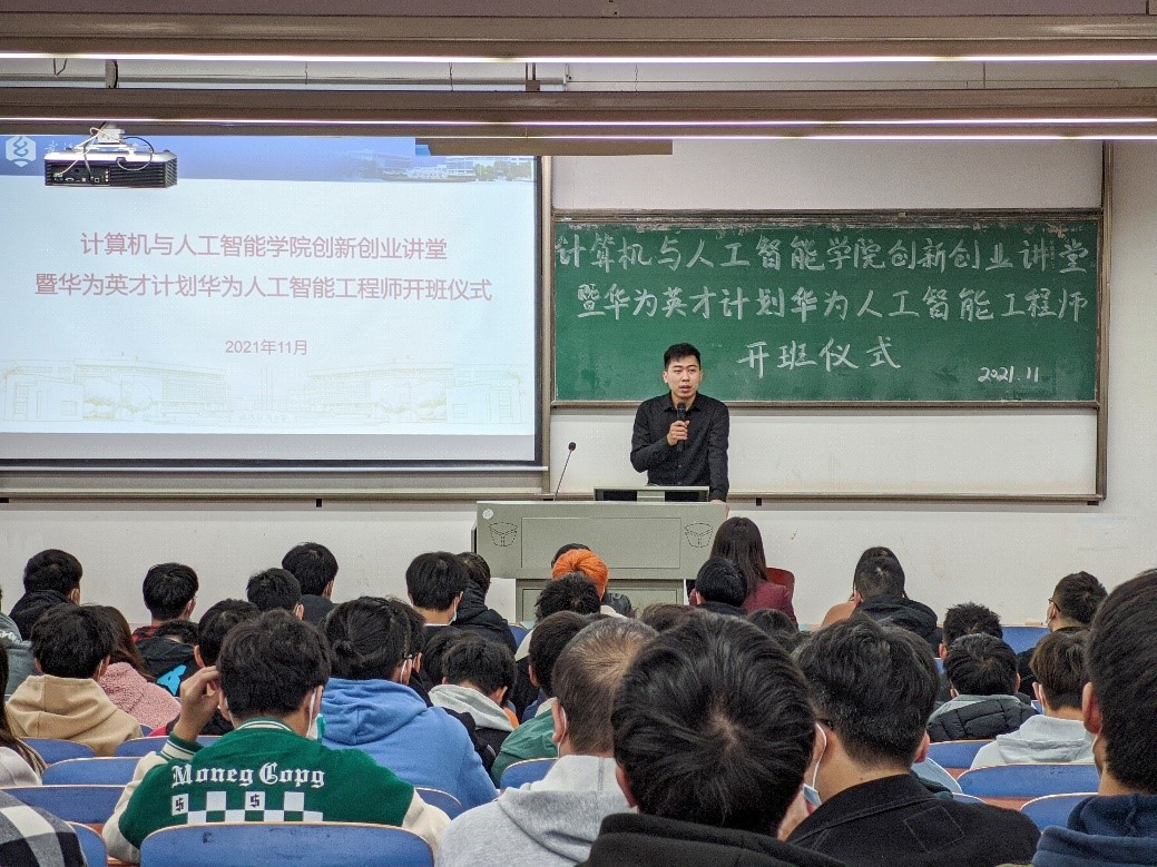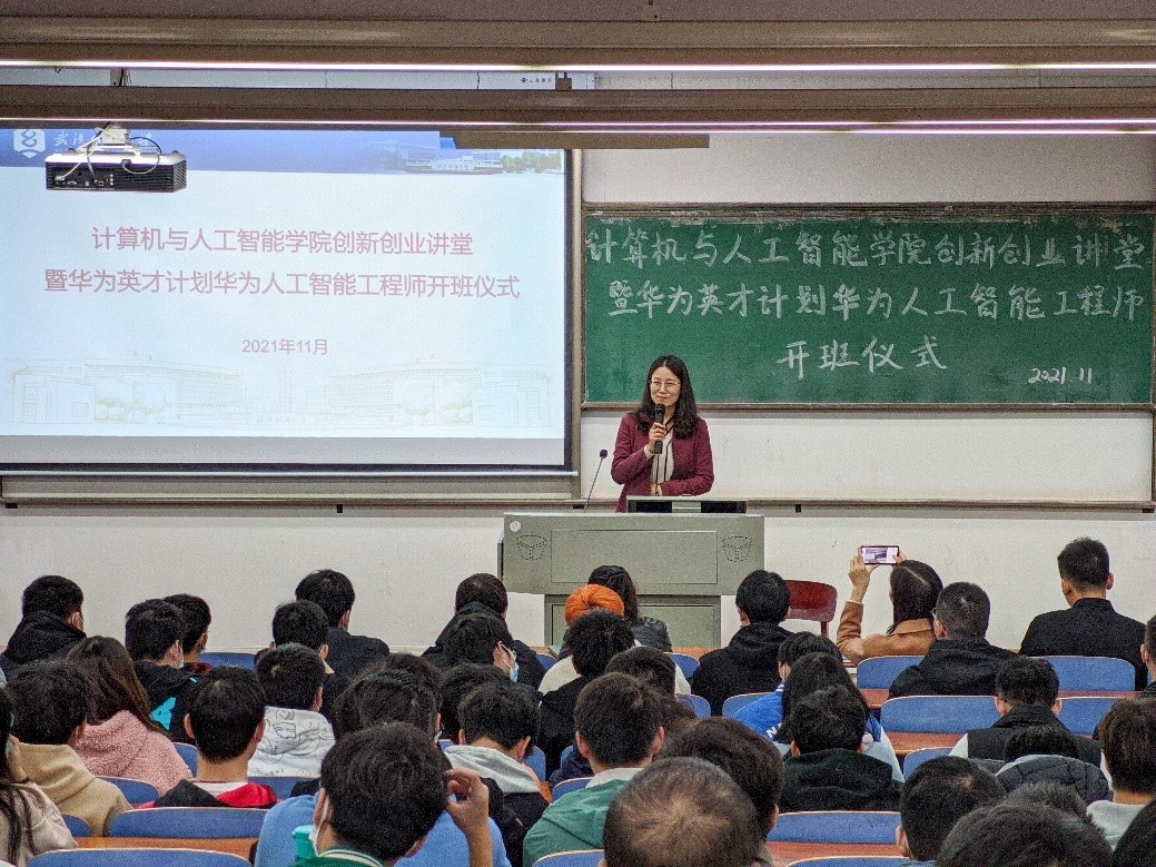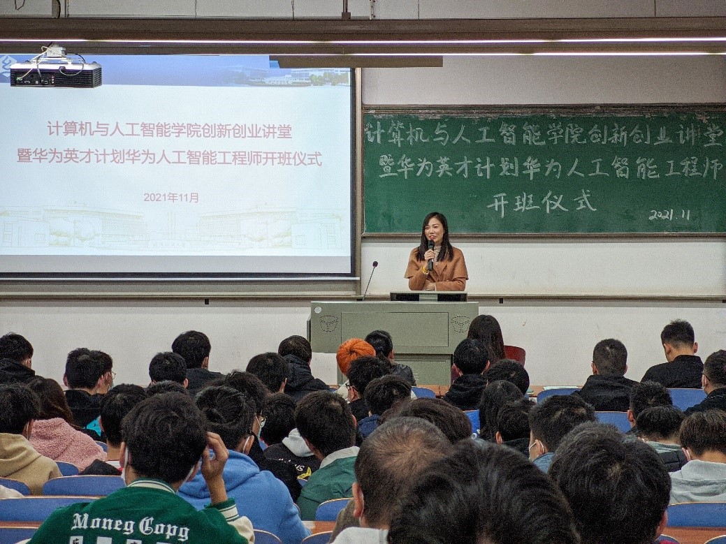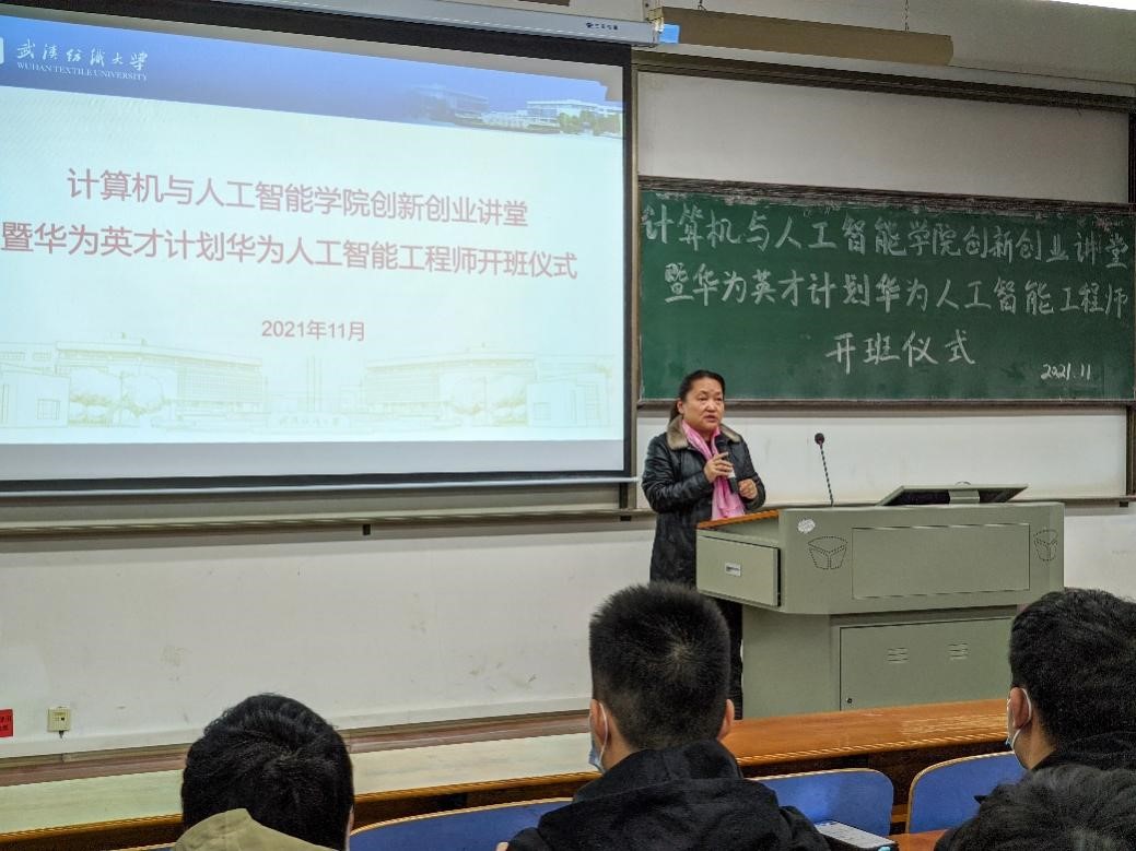随着网络技术的发展趋势、新时代对网络技术的要求也越来越广。为了进一步增强广大学生获取专业认证证书的意识,营造浓厚的学习氛围,增加学生的实践能力,提升就业综合竞争力,满足企业对人工智能工程师的需求。11月25日下午男同 创新创业讲堂暨华为英才计划华为人工智能工程师开班仪式于崇志楼T102教室如期举行,27-28日正式培训在A4030A会议室以线上线下相结合形式举行。学院院长胡新荣、武汉科云信息技术有限公司总经理刘天梅、培训部经理赵辰龙及培训班级班主任孙成艳出席了本次活动。本次活动由学院党委副书记涂耀威主持。