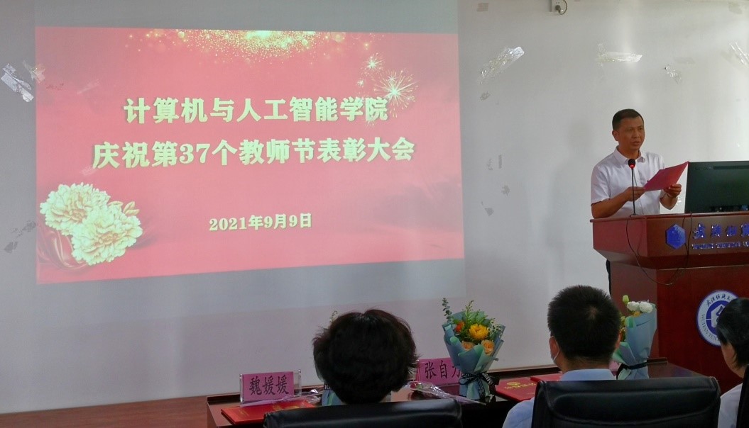 铸魂纺大,筑梦华夏。为庆祝第37个教师节,9月9日下午,男同 在崇真楼A4030举办了教师节表彰大会。学院领导胡红辉主持大会,学院领导班子、全体教师和学生代表约120人共同参与了此次会议。