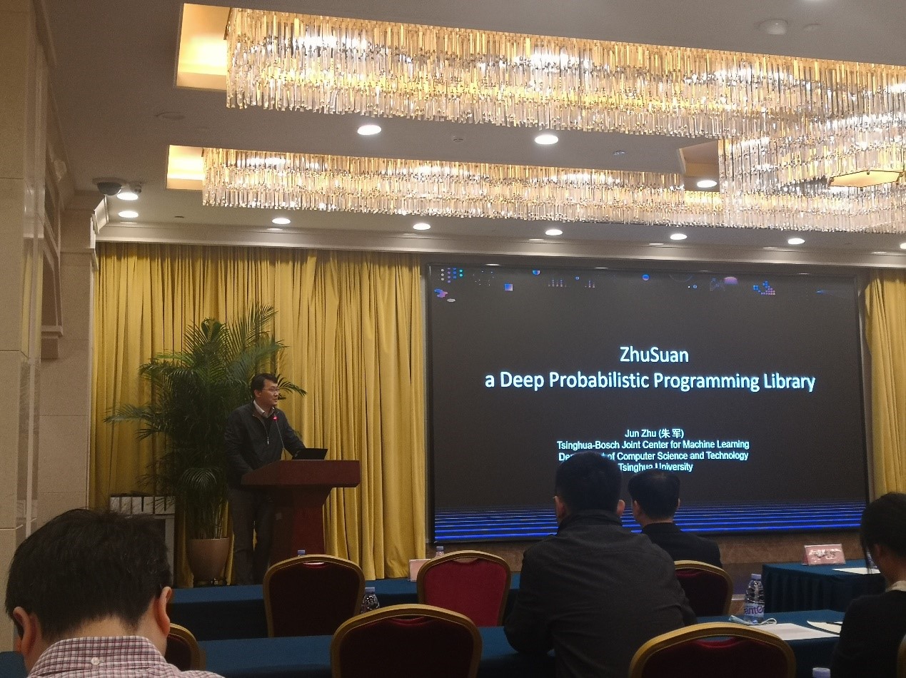 会上,清华大学朱军教授对“可微分概率编程及其应用”进行了简要报告,对传统DNN的局限性做出了简要概述,并对珠算框架下使用Bayes-DNN,将可微编程和概率编程相结合,数据处理后再进行拟合的方法进行了思路分享,同时对“计图”框架表示了高度赞同,对向“计图”框架中移植珠算编程库很有信心。