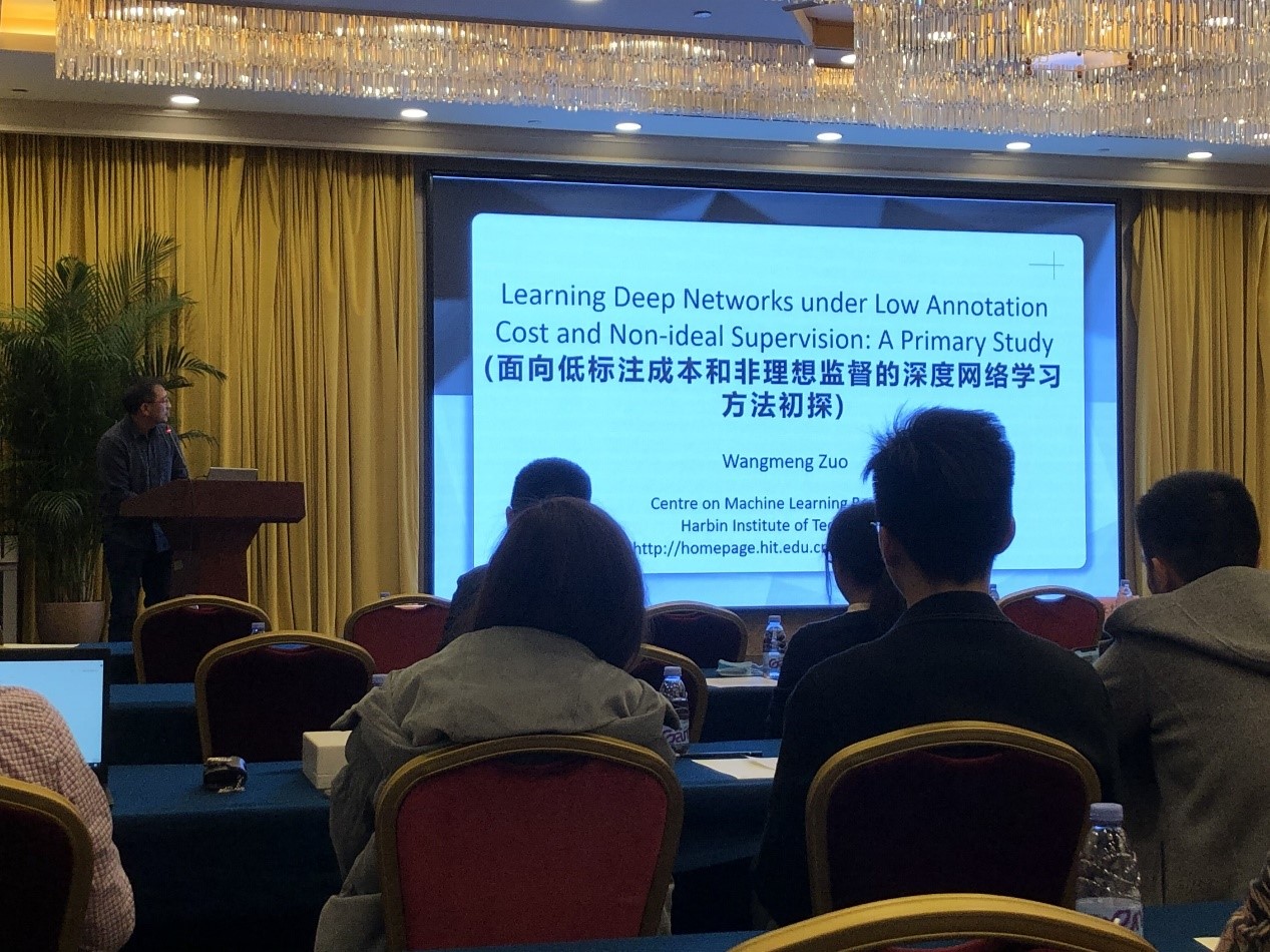 哈尔滨工业大学左旺孟教授就“面向低标注成本和非理想监督的深度网络学习方法初探”一题进行了简要报告。左教授对当前机深度学习的标注成本进行了展示,表示当前深度学习框架对数据及标注要求相对较高。通过将多个框架与标注方式进行对比,左教授展示了一种相对效果不弱的低标注成本方法,使用Resnet等训练网络在ImageNet数据集训练结果准确率下降不到1%,拥有较好等发展前景。