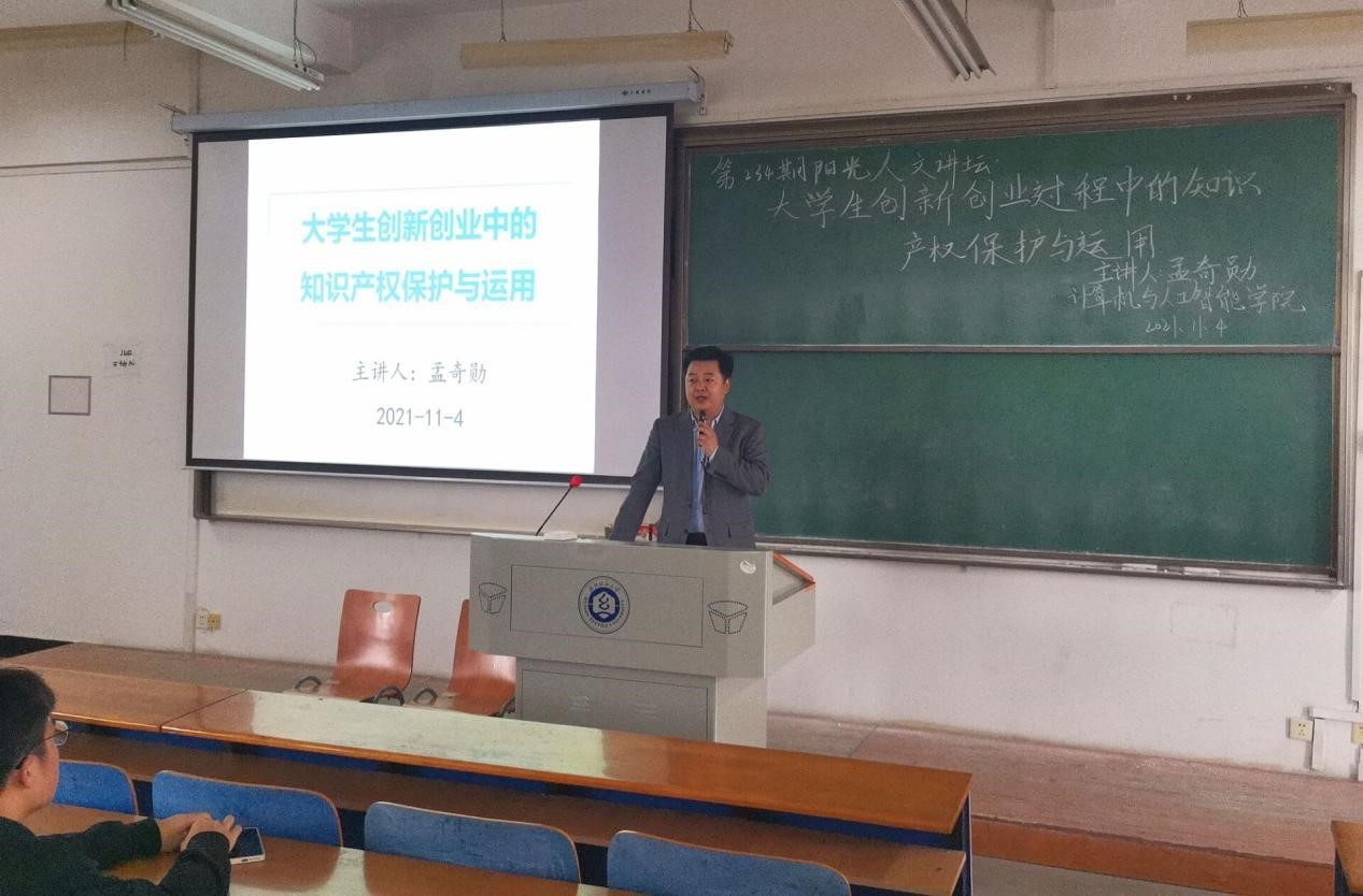 11月4日,由校团委主办、男同 承办的第234期阳光人文讲坛——大学生创新创业过程中的知识产权保护与运用在崇志楼516如期举行。本次讲坛邀请了武汉理工大学法学与人文社会学院副教授、专硕中心副主任孟奇勋,为同学们讲解大学生创新创业过程中知识产权的保护与运用,学院党委副书记涂耀威出席了本次讲坛。