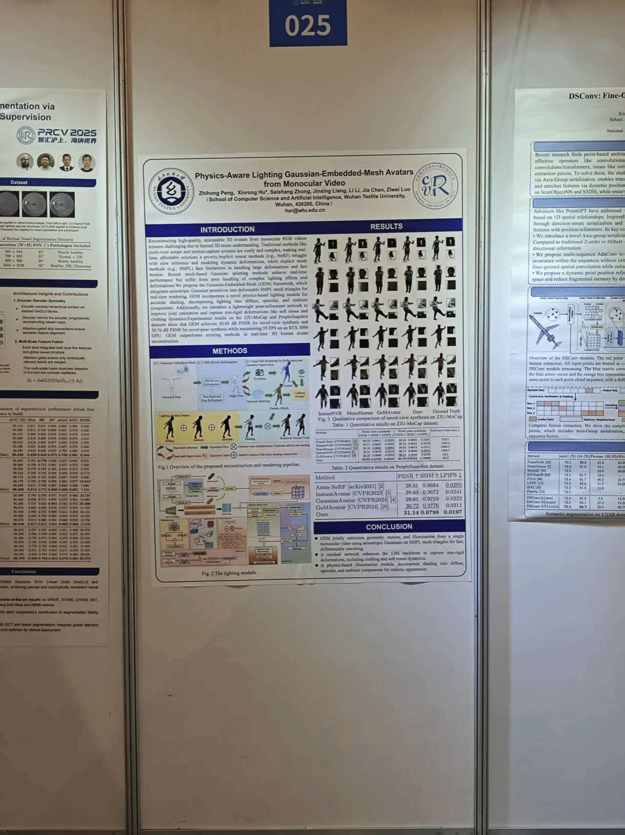 2023级硕士研究生彭志宏同学的论文《Physics-Aware Lighting Gaussian-Embedded-Mesh Avatars from Monocular Video》成功入选PRCV 2025,并于10月17日进行了海报展示。该研究针对单目视频重建高质量、可点亮的3D数字人这一挑战性问题,提出了一种创新方法,通过将物理光照信息嵌入高斯表示的网格中,显著提升了重建头像的逼真度和光照适应性。该方法在保持计算效率的同时,实现了更高质量的3D头像重建,为虚拟现实、数字人等应用提供了有力支持。
