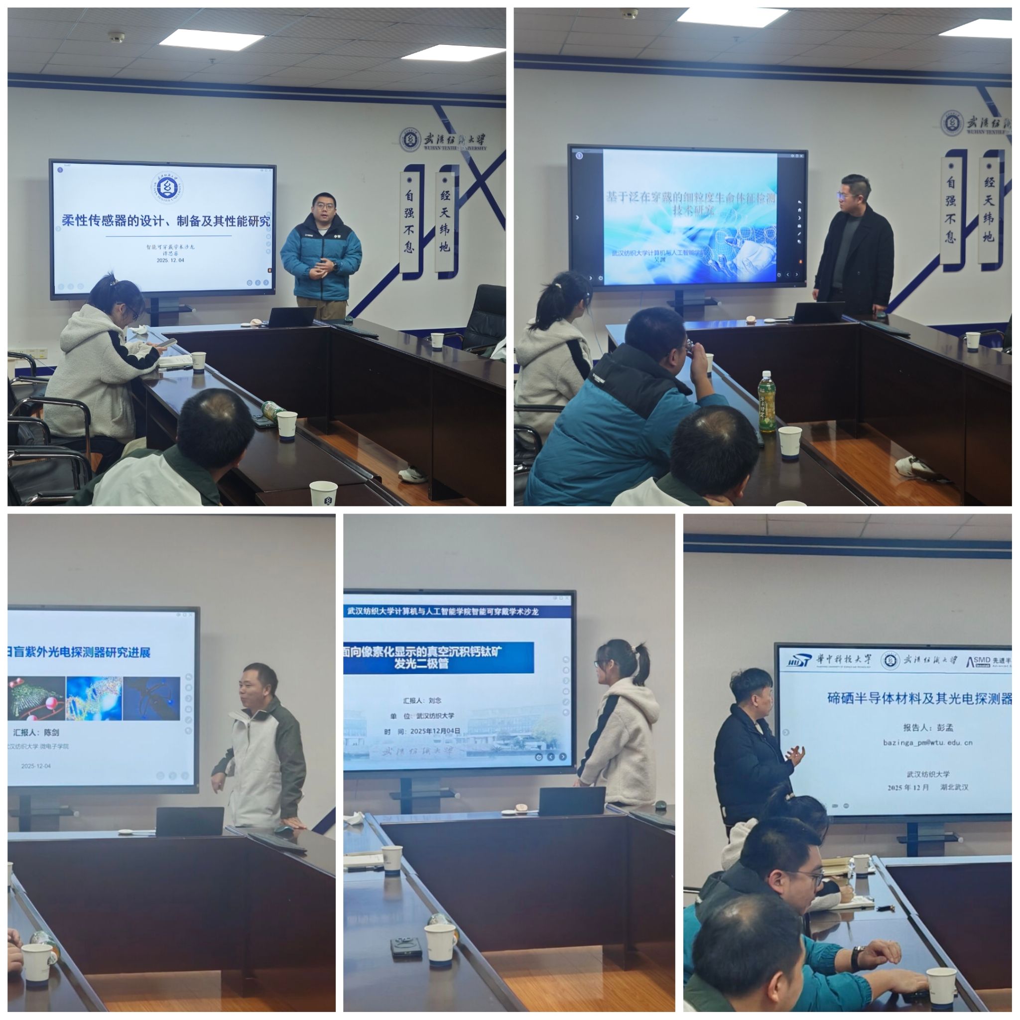 在会议中,五位老师围绕智能可穿戴技术及相关领域作了精彩报告。纺织学院谭思睿作题为“柔性压力传感器的设计、制备及其性能研究”的报告;微电子学院刘念、彭孟、陈建分别就钙钛矿发光二极管、碲硒半导体材料光电探测器、日盲紫外光电探测器等方向分享最新研究成果;男同 吴渊作“基于泛在穿戴的细粒度生命体征检测技术研究”报告,系统阐述了可穿戴设备在健康监测领域的应用前景。