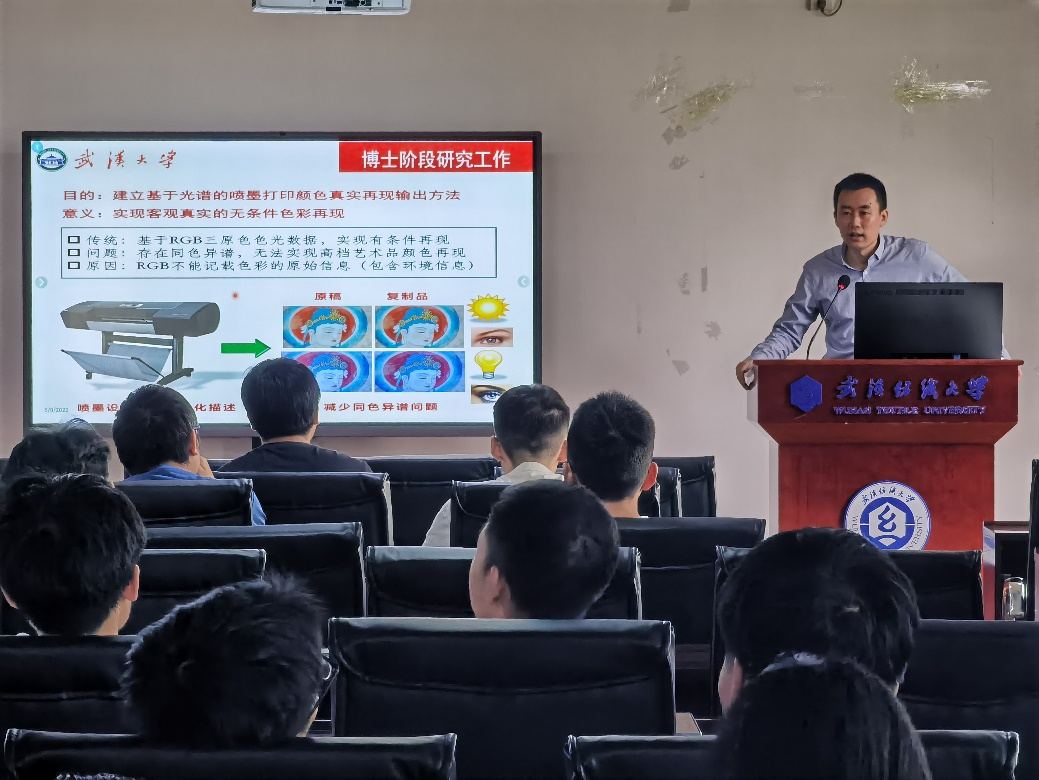 刘强博士系统梳理了从攻读博士开展光谱打印研究课题,到工作之后在照明光品质和颜色视觉研究内容及成果,通过丰富的实验研究案例带领男同 师生深入了解光、色和视觉感知的逻辑关系和科学联系,拓展了男同 师生在计算机图形处理与颜色科学交叉领域的相关基础知识,并从光品质和服饰照明、纺织面料仿真等方向探讨了纺织、计算机与照明研究的结合点。报告引起了男同 师生的强烈反响,刘强博士就男同 师生提出的问题一一进行了耐心细致的解答。