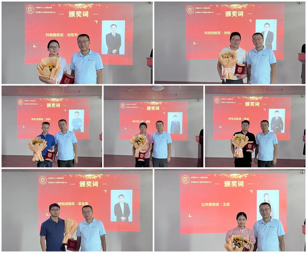 院长胡新荣揭晓了学科专业奖、人才工作奖、教学质量奖等13个奖项。分别为叶鹏、李艳华、崔树芹、潘雄、刘军平、李明、余锋、廖龙、王兆静、王帮超、李敏、王晨、梁金星13位获奖老师颁发荣誉证书,学生代表向受表彰教师依次献花。