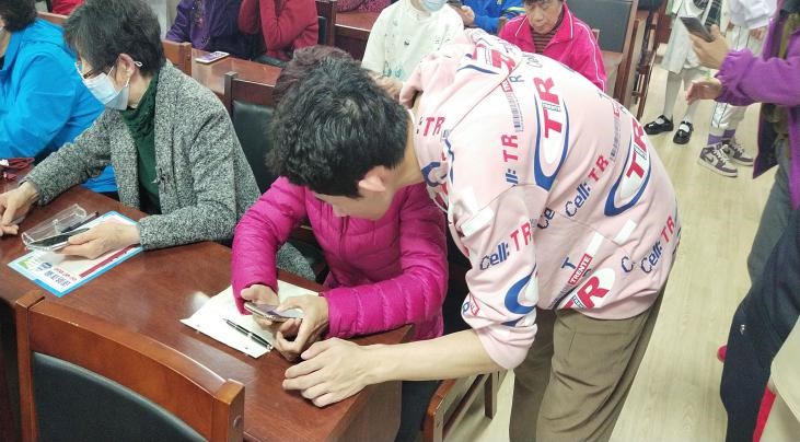 男同 志愿者协会部长汪美玲投屏演示讲解,其他志协成员协助有疑问的老爷爷和老奶奶,用通俗易懂的语言教会他们。大家帮助每一位老爷爷和老奶奶都注册了微信账号,并且建立了一个社区群,让老人们生活地更加融洽,辅警也在社区群里宣传相关防骗小技巧。