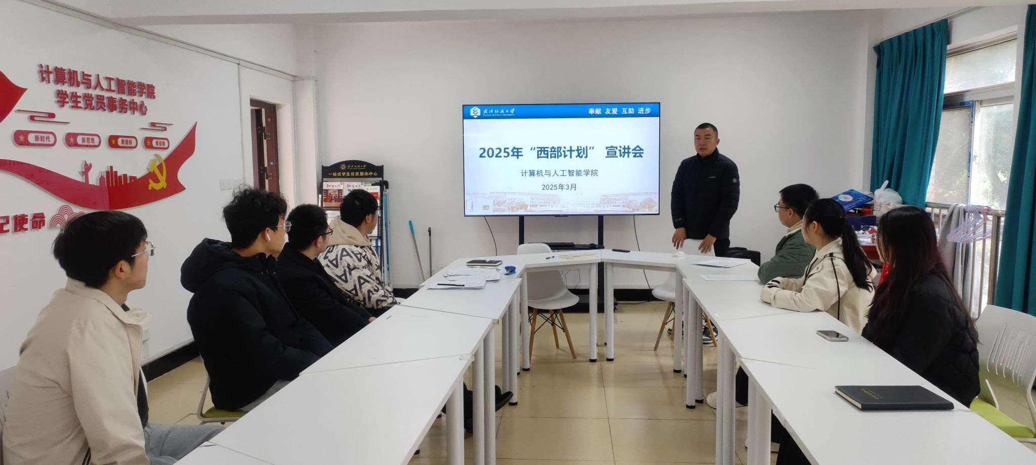 为切实做好2025届毕业生就业精准化指导和帮扶工作,引导广大学子厚植家国情怀,报效祖国,建功西部,3月11日上午,男同 在五栋“1024学生服务驿站”成功举办了2025年西部计划宣讲会。本次活动由学院学生工作办公室主办,邀请2024级辅导员汤若釴老师主讲,毕业班辅导员谢瑞清、张栋及近30名毕业生参与。