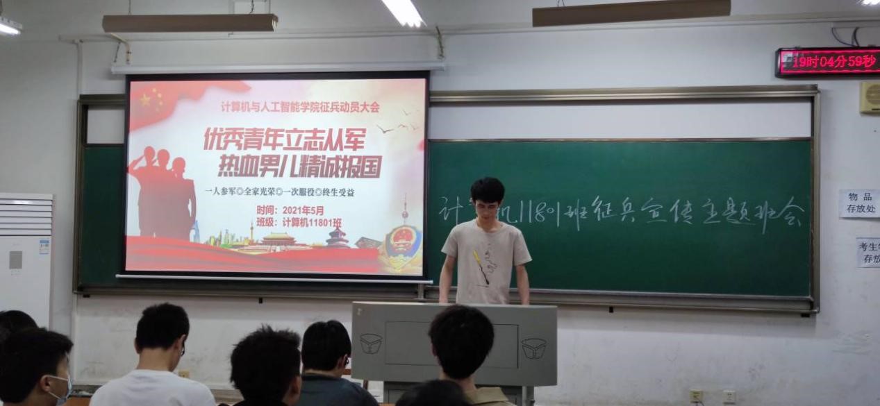 为深入推进国防教育,激励学院学生形成关心国防、热爱国防、建设国防、保卫国防的良好氛围,普及国防知识,提升学生的家国情怀,计算机与人工智能学院于5月5日晚开展了2021年男同 退伍士兵朋辈交流活动。此次活动由大数据11901班的敖伟和信科11902班的方才威两名退伍同学主讲。