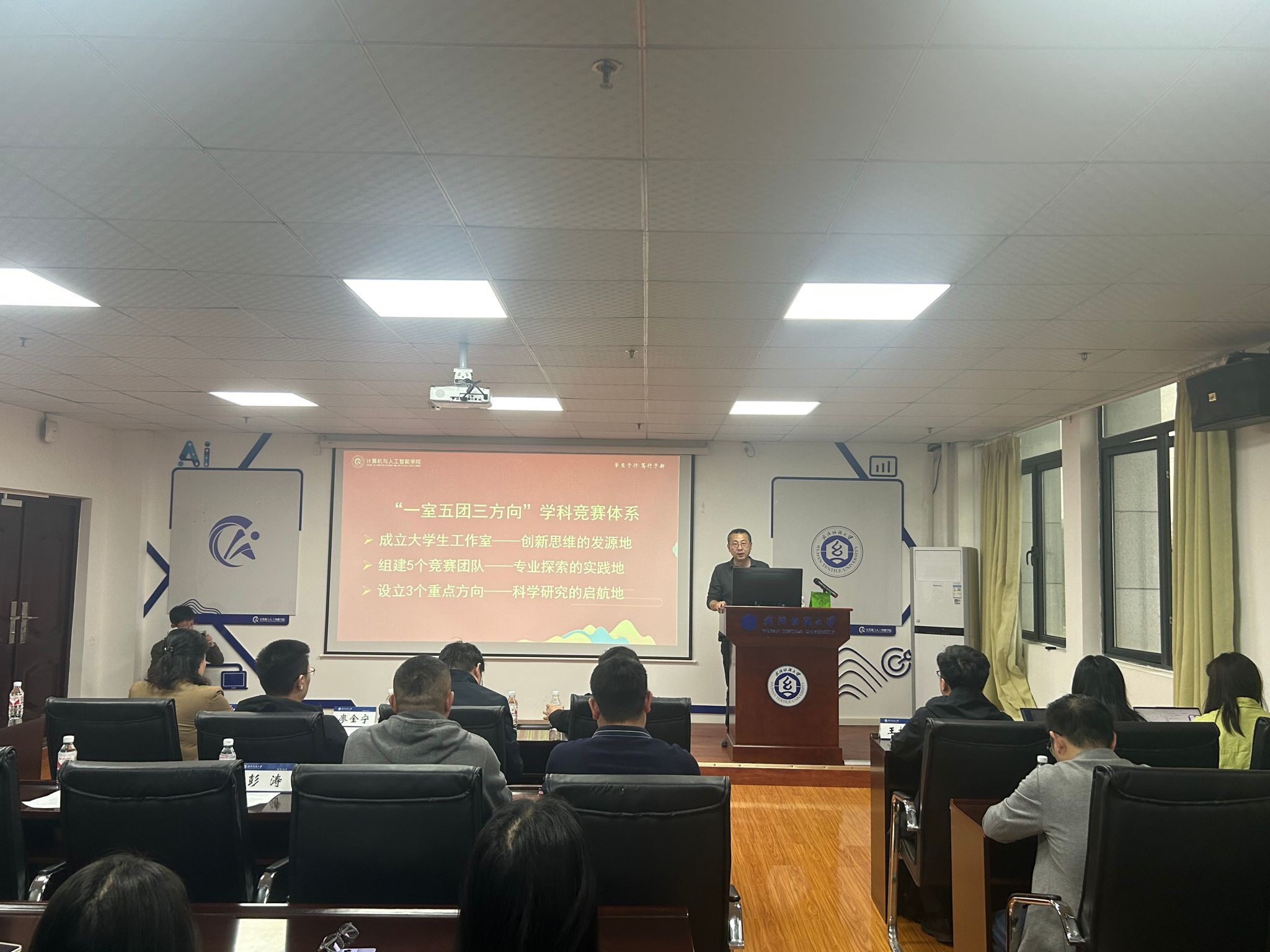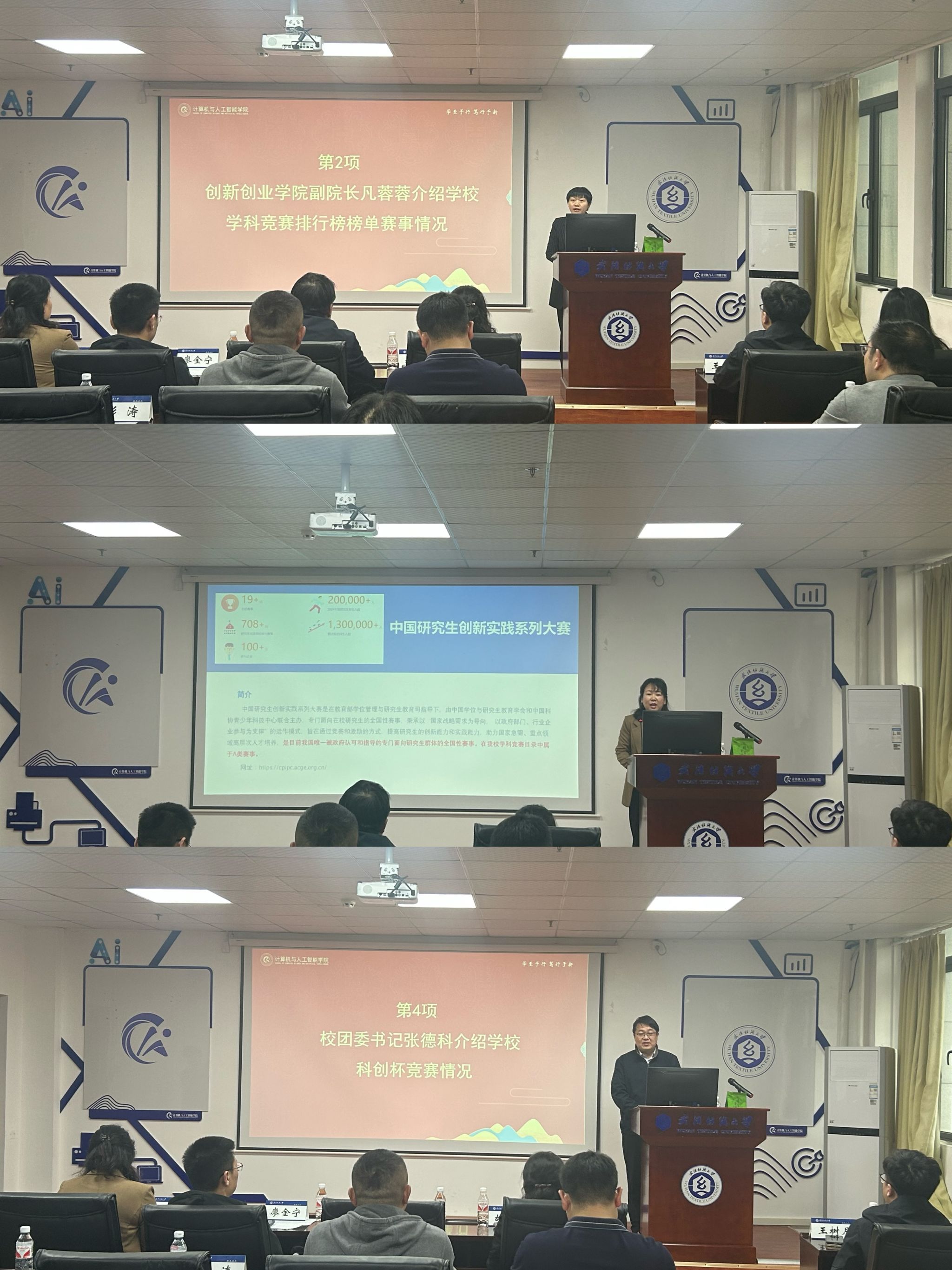 随后,凡蓉蓉、刘欣、张德科分别作主题发言。凡蓉蓉聚焦学校学科竞赛排行榜榜单赛事,解析了竞赛分类与评价标准;刘欣围绕研究生学科竞赛情况进行介绍,强调了科研创新与学术能力的培养路径;张德科重点介绍了“科创杯”竞赛的参赛规则与学校支持政策,为师生参赛提供方向指引,同时鼓励同学们牢牢把握人生的正确航向,珍惜青春、脚踏实地、奋发有为,谱写更加辉煌的大学生活。