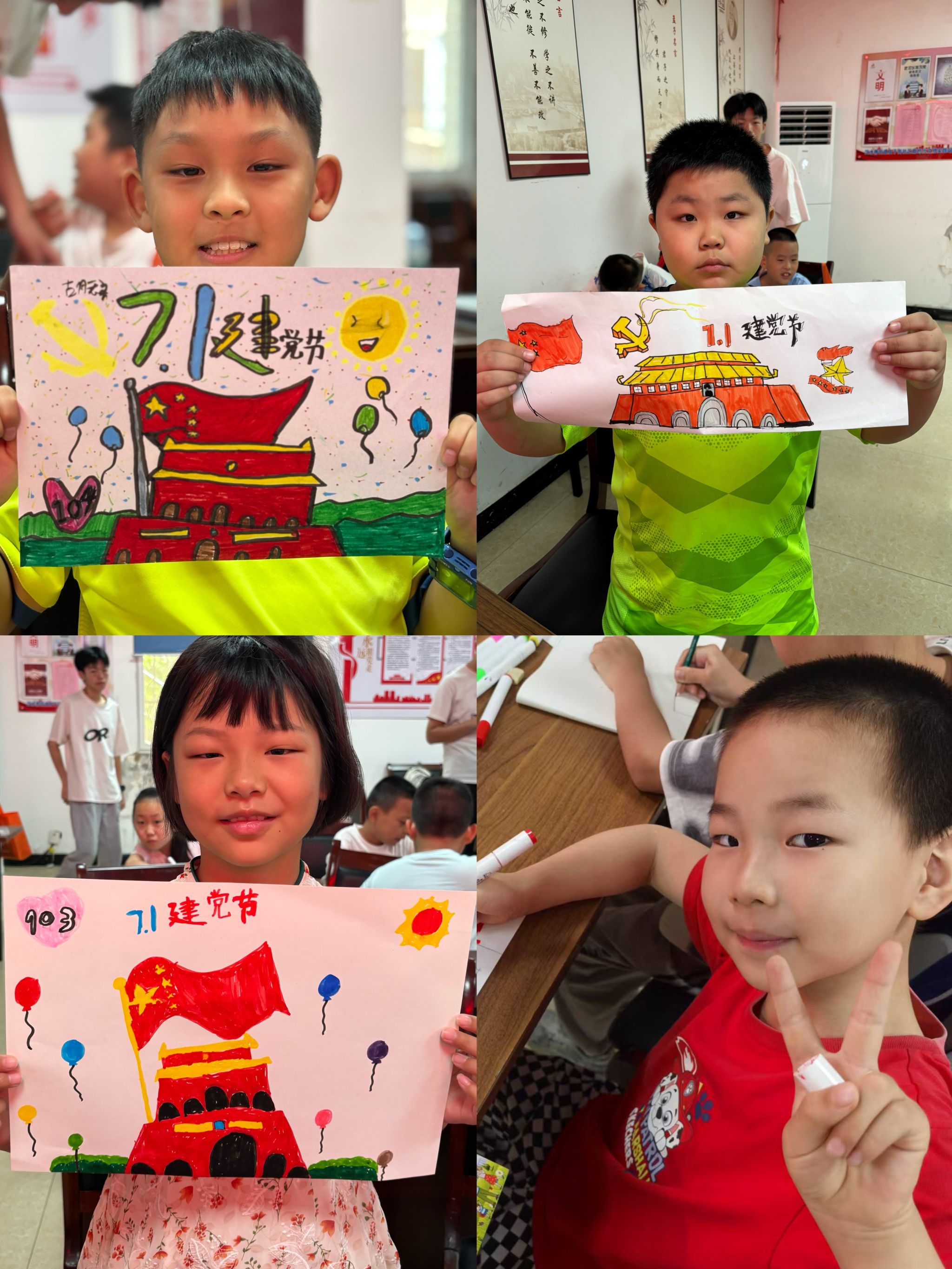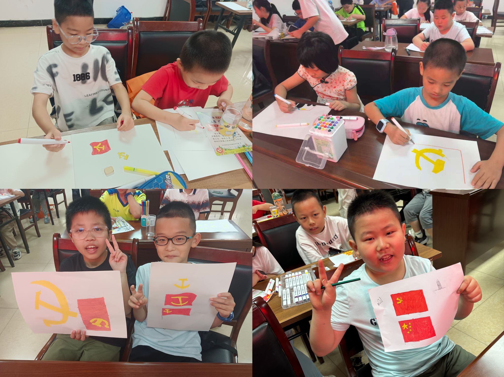 在绘画环节,实践团成员指导小朋友们亲手绘制党旗、党徽。孩子们用稚嫩的小手,认真勾勒党旗的轮廓,仔细填充鲜艳的色彩。一面面党旗在孩子们的笔下徐徐呈现,展现出新时代的少年先锋队员对党的崇敬与热爱。