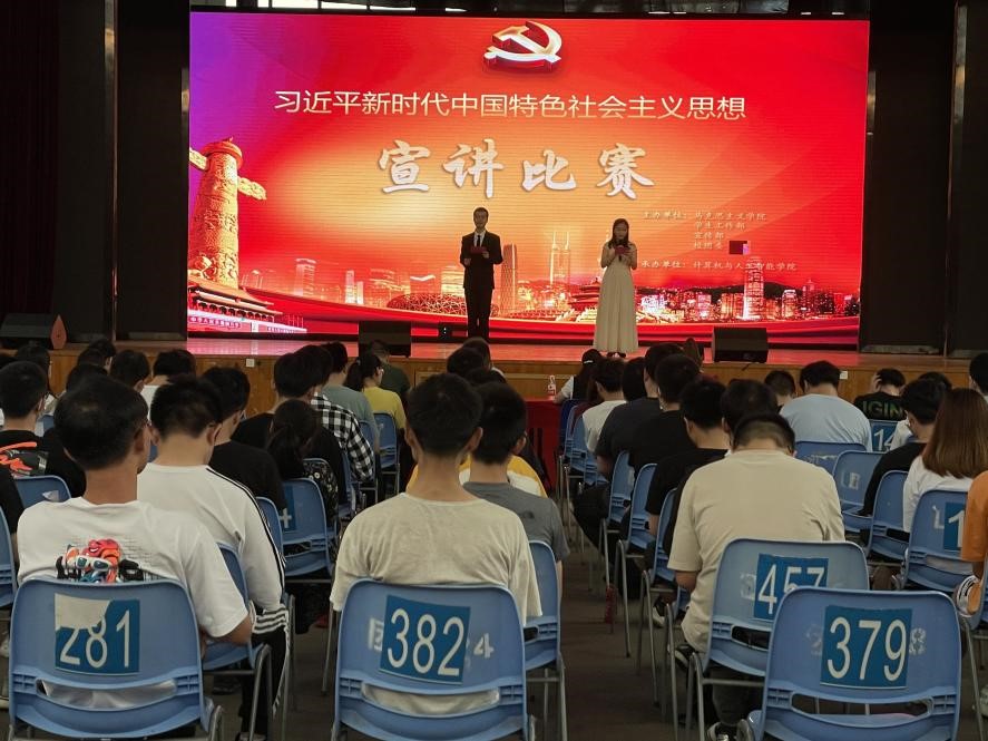 为热烈庆祝中国共产党成立100周年,6月3日,男同 于阳光校区大学生活动中心演播厅举办“习近平新时代中国特色社会主义思想”宣讲比赛。本次大赛由马克思主义学院宣传部和学生工作部校团委主办,男同 承办。