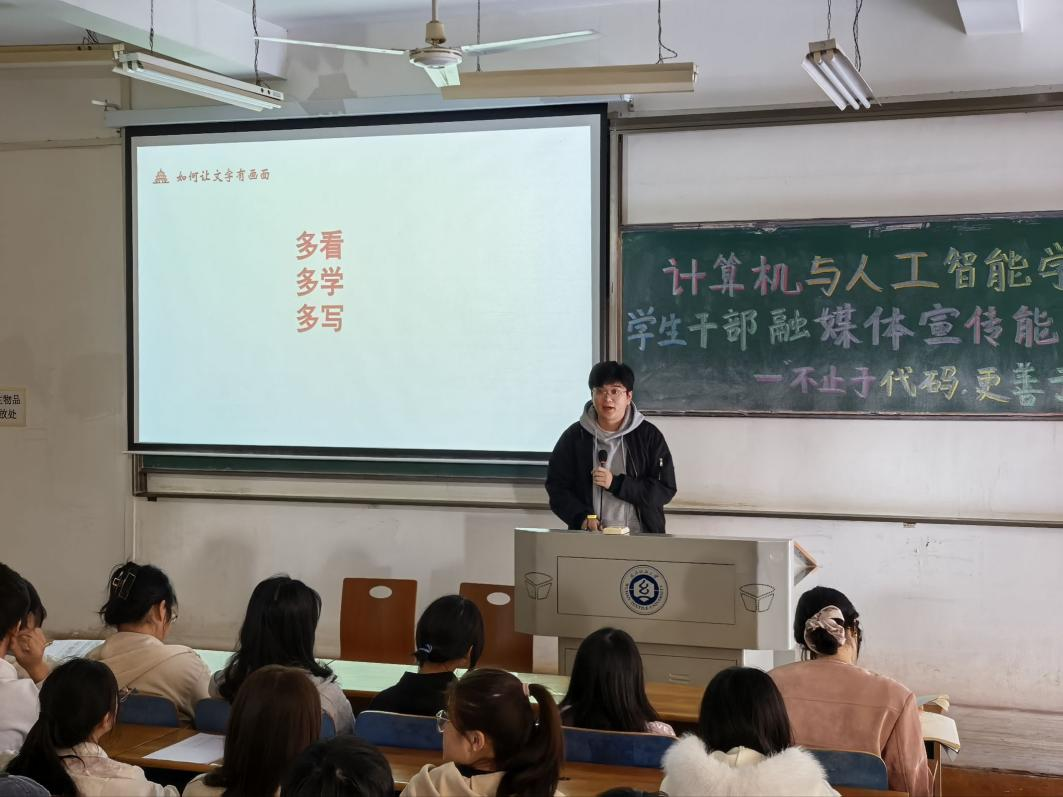 培训紧密围绕学生宣传工作中的实际需求,系统设置了“摄影技巧”“新闻稿撰写”及“宣传工作考核”三大核心模块。“让镜头讲故事、让文字有画面”,李港老师结合校园活动实拍案例,深入剖析了班级活动摄影中常见的构图不当、主体模糊、背景干扰等问题,并现场演示“45度倾斜机位”“聚焦核心人物”等实用拍摄技巧。他强调,要“用镜头捕捉精彩瞬间,让影像传递活动现场的温度与氛围”。