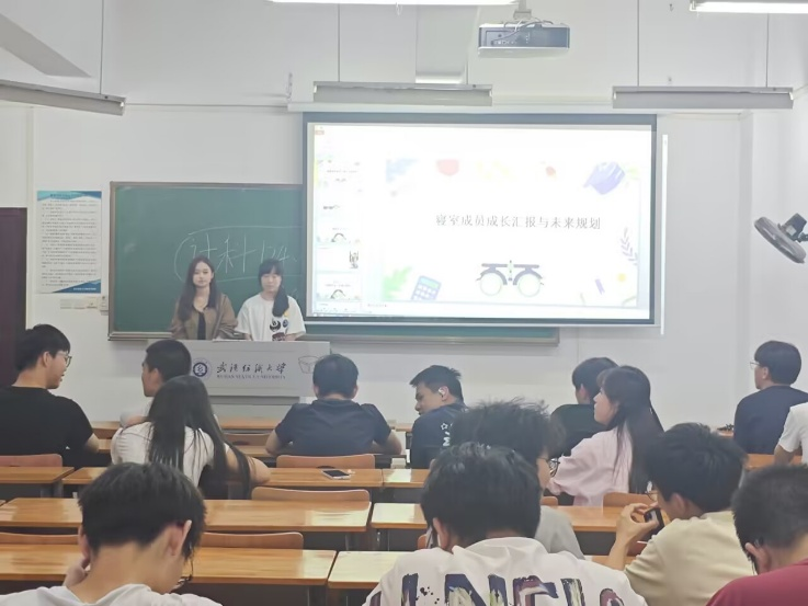 12B506寝室(成员陈畅、韩思源、杨佳沅)汇报:成员分工明确、氛围融洽,均任职学生工作,且有清晰卫生管理机制。三人本学期均无挂科,各有优势学科,也认识到英语、编程等短板。未来将深耕专业核心知识补短板,接触前沿技术、参与实践竞赛,制定科学计划筑牢根基,展现了学业与学生工作的双向成长。