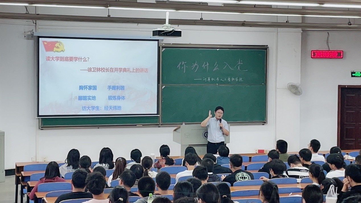 为促进新生更好的了解党、认识党,学习中国共产党的优秀品质,产生积极向党组织靠拢的动力心向;同时加深新生对专业的理解与认知,提升大学学习规划的合理性和科学性。男同 邀请了学院党委副书记涂耀威、软工系史爱武博士,于10月7日14:20在3号教学楼T202和319教室为新生作了《你为什么入党》和《大学4年,怎样成为优秀的自己》的主题讲座。涂耀威副书记、史爱武博士、新生辅导员及全体2021级学生参加了此次讲座。