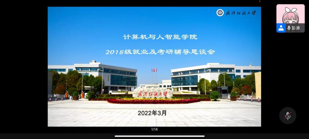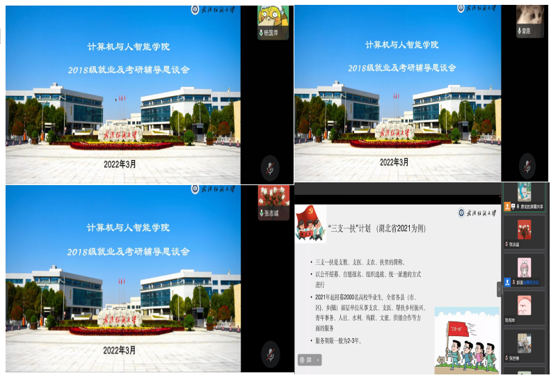 为进一步推进学院18级毕业生就业工作,帮助学生更充分、更高质量就业,学院于3月13日晚上举办线上就业及考研辅导恳谈会,邀请计科系主任彭涛教授做成长导航,就研究生复试和就业中的问题指点迷津,请18级已签约的曾路、张志诚、杨国萍三位同学做朋辈领航,交流找工作中的心得。毕业班辅导员廖龙以及18级计算机科学与技术专业全体学生参加线上会议。