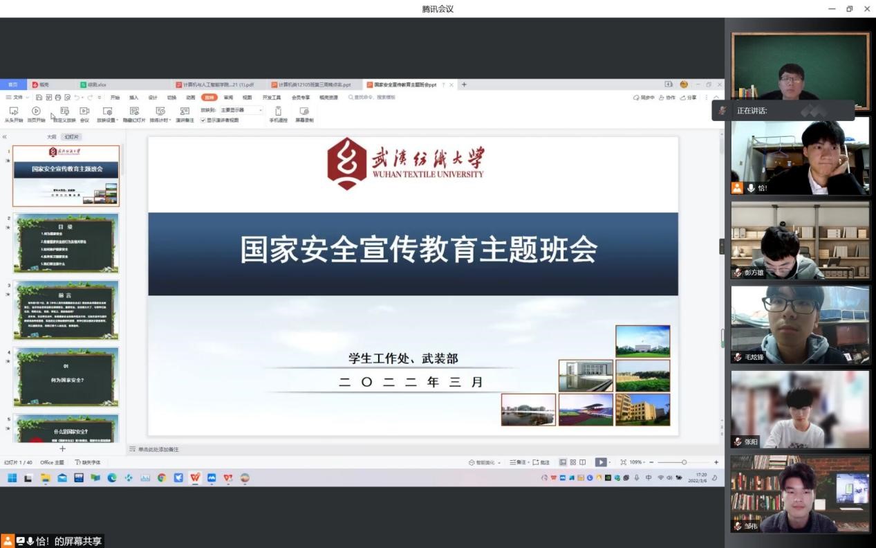 为深刻认识党的百年奋斗在维护国家安全上的重大成就和历史经验,进一步认清国家安全形势,引导广大学生理解中华民族命运与国家关系,践行总体国家安全观,将国家安全教育融入学生日常教育活动中来。计算机学院于3月6日晚点名班会时间,积极组织各年级开展了“开学第一课”国家安全宣传教育活动。