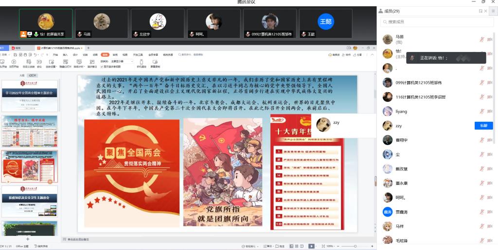 为了深入贯彻落实全国两会精神,引导学生深刻领会、准确把握两会精神实质,切实增强青年学子的责任感和历史使命感。计算机学院各个年级于3月13日,通过线上会议,组织全体同学统一开展了学习两会精神的主题班会,各年级辅导员、各班班主任全程参会。