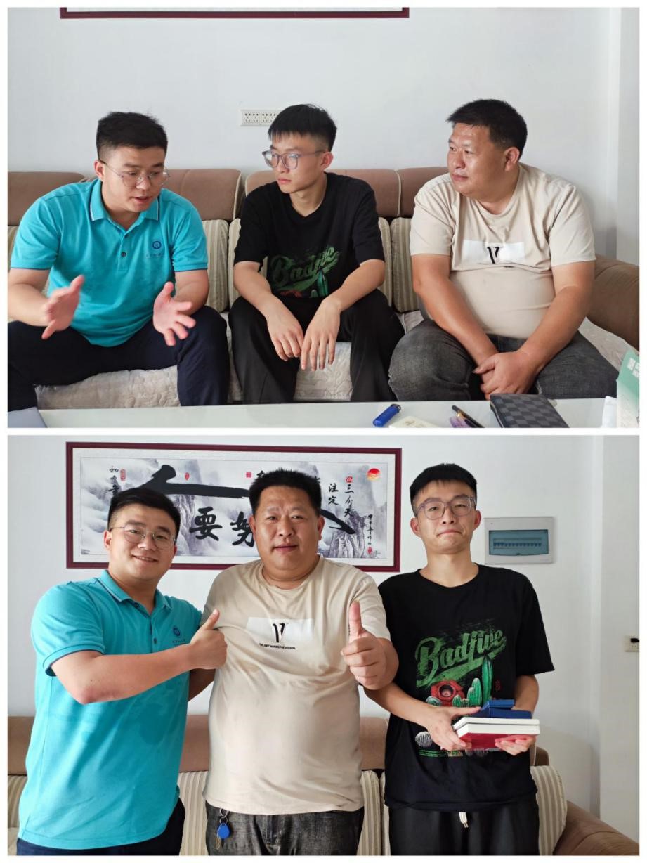 此次家访,四位老师共深入了四名学生家庭,通过与学生各家庭成员的面对面沟通交流,全面了解了学生的成长环境、生活表现和家庭状况以及教育状况,并及时把学生在学校的学习情况和生活情况反馈给家长。沟通过程中,家长们提出了很多教育中的困惑,比如“如何提高孩子的就业竞争力”,“如何让孩子有个充实的暑假”等,老师们都一一做了解答,并特别提醒家长注意学生在家的假期安全。同时,老师们还给家里带去了学校校徽和校牌、水杯、T恤衫等慰问品,也为学生送上了《习近平与大学生朋友们》以及学院教师编写出版的《计算机专业大学生之路:四年让你变得优秀》两本书,勉励学生在大学期间努力学习,练就扎实的计算机专业能力,成为更优秀的自己,共创美好未来。另外,老师们也向家长和学生进一步讲解学校资助和奖励政策,宣传了学校关于大学生参军入伍的政策,鼓励学生努力学习、充实生活、积极奋进、携笔从戎。