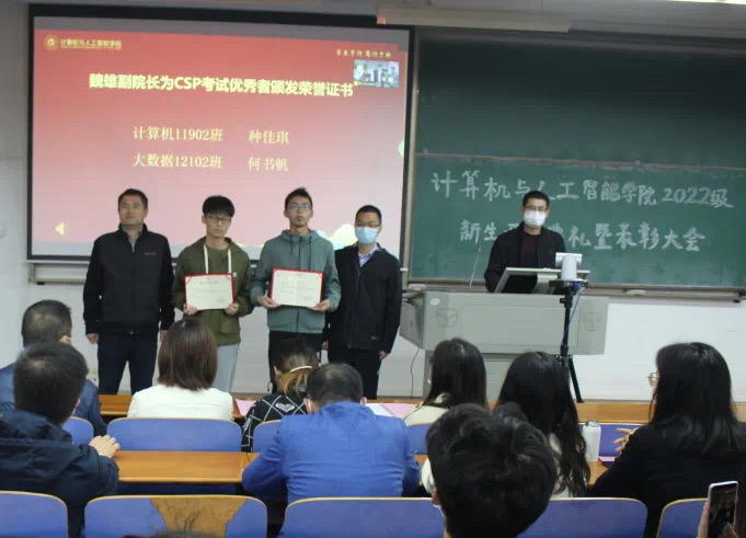 魏雄和指导老师陈常念为CSP考试优秀者颁发荣誉证书