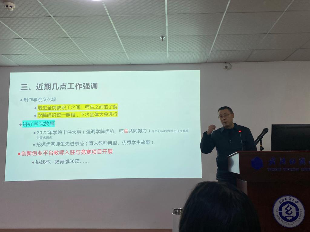 会上,晏伟带领全体教师回顾了上一年度学院学生工作的整体情况和取得的成绩,充分肯定了班主任老师的辛勤付出和努力成果。并结合学生工作中存在的问题,将新学期的新思路和新要求进行了充分交流。他指出开学第一周是考试周,希望全体班主任老师适时安排时间为同学们做考前辅导和答疑,进行学业帮扶,助力学生顺利考试。春季为心理问题高发期,提醒班主任多多关注学生心理健康,提供适宜的心理疏导。最后向涛就本周班会事项进行了强调,号召班主任组织开展好新学期的第一次班会,并鼓励班主任在班会上大力宣传学院2022年的十件大事,以此增强学生的专业认同感、学院归属感和学业自信感。