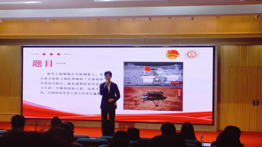 决赛分为两轮比拼,第一轮——“我是新时代好青年”,共有两个环节,一是个人风采展示,选手以视频短片形式,进行限时40秒的自我介绍和风采展示。二是自备稿件,选手进行限时3分钟的自备稿件展示。杨冠宇同学以《朗读者》为题,生动模拟主持情境,深度还原作品本真,声情并茂、情感真挚地带领全体观众体验了一场视听盛宴,最终在第一轮比拼中以第二的好成绩晋级第二轮比赛。第二轮——“我当新锐主持”,选手根据给定主题进行模拟主持,限时3分钟。杨冠宇同学以“校长徐卫林院士团队研制的‘月面国旗’在月球成功展示”为素材,在扩充内容后以新闻类节目主持方式进行播报。他再一次以高超的语言组织能力、富有感染力的舞台表现能力赢得了阵阵掌声和评委的青睐。最终取得总成绩第三的好成绩,荣获二等奖。