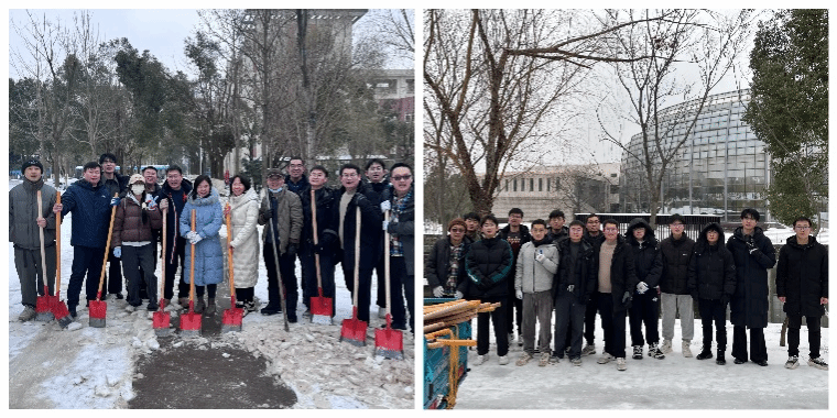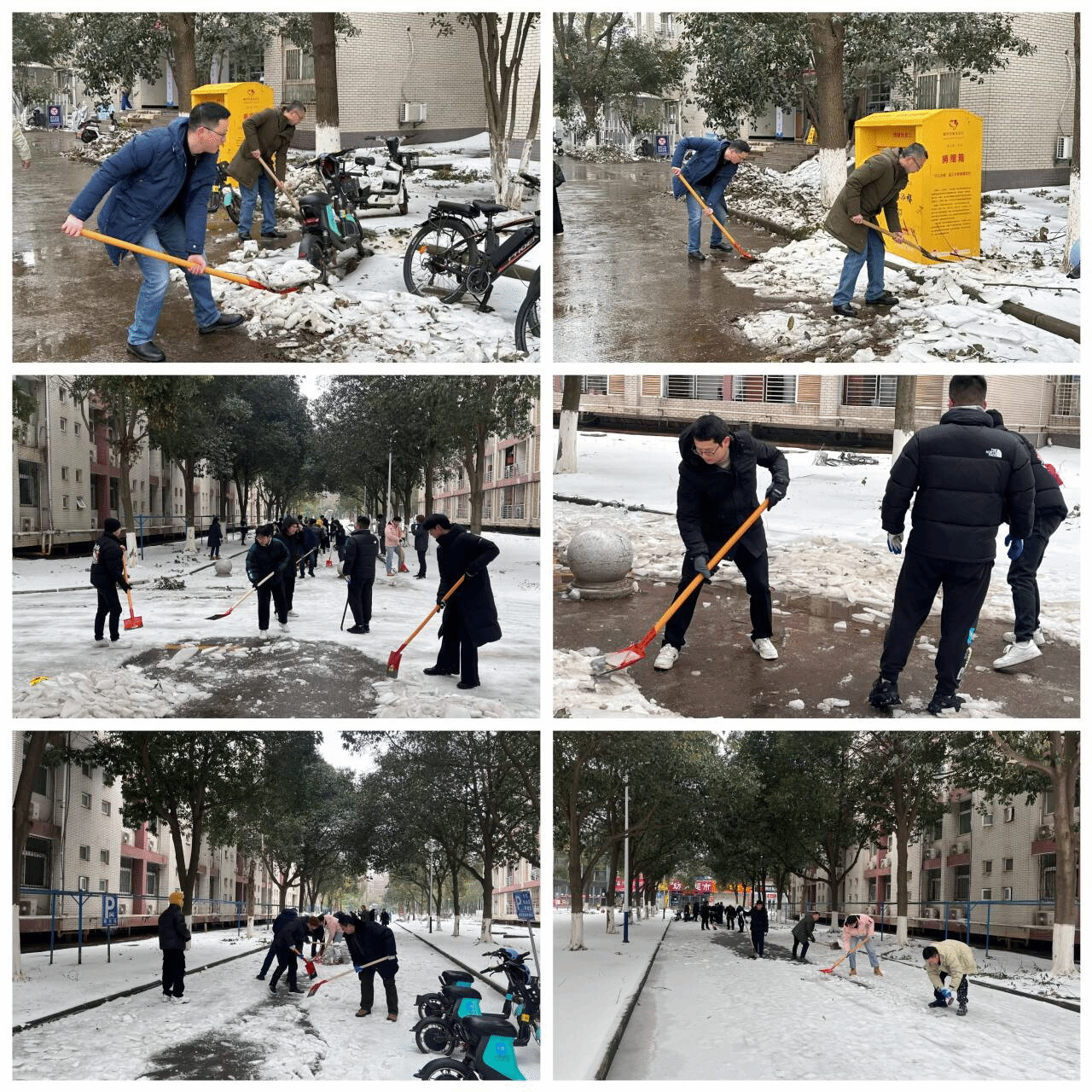 在除冰现场,大家拿起铁锹、扫帚等工具,奋力清除积雪和冰块,分工明确,配合默契,干劲十足,热情高涨。在大家的共同努力下,校园内各主要道路的积雪和冰块被清除干净,为师生们创造了安全、整洁的出行环境。