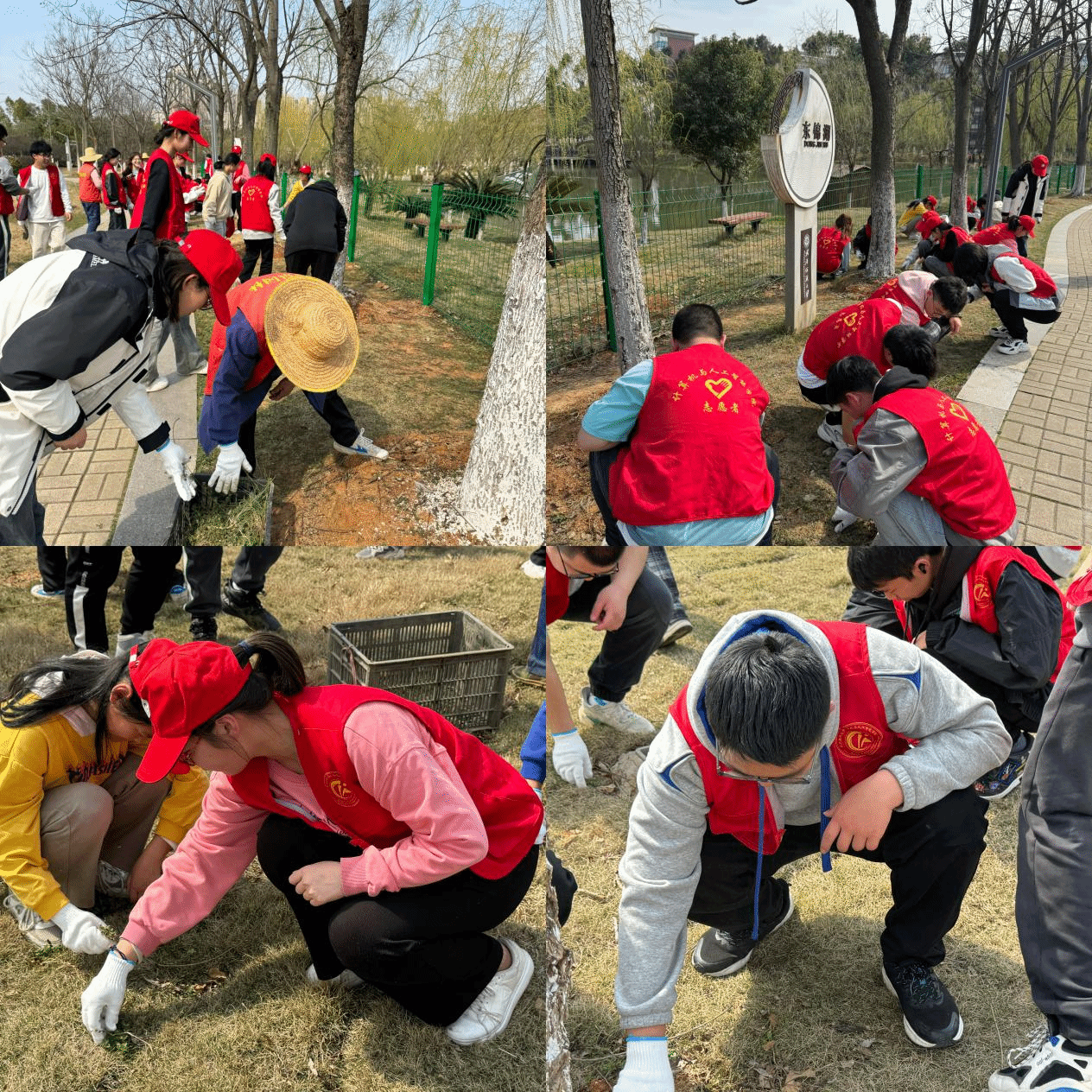 活动现场,老师们先带领同学们认识了校园中的植物,详细介绍了杂草和花草的区别,并进行劳动示范。掌握正确的清除杂草的方式后,同学们热情高涨,身着志愿者马甲,戴上白手套,干劲十足,沿着经纬栈道出发,清理草坪杂物。同学们蹲下身子弯下腰,拔草、捡草,各显神通,投入到如火如荼的劳动中,为营造绿色校园贡献一份光和热。经过同学们的辛勤劳动,原本长满杂草的地方焕然一新,东锦湖旁、博学桥边,到处是同学们弯腰忙碌的身影,为春季校园增添了一道靓丽的风景线。
