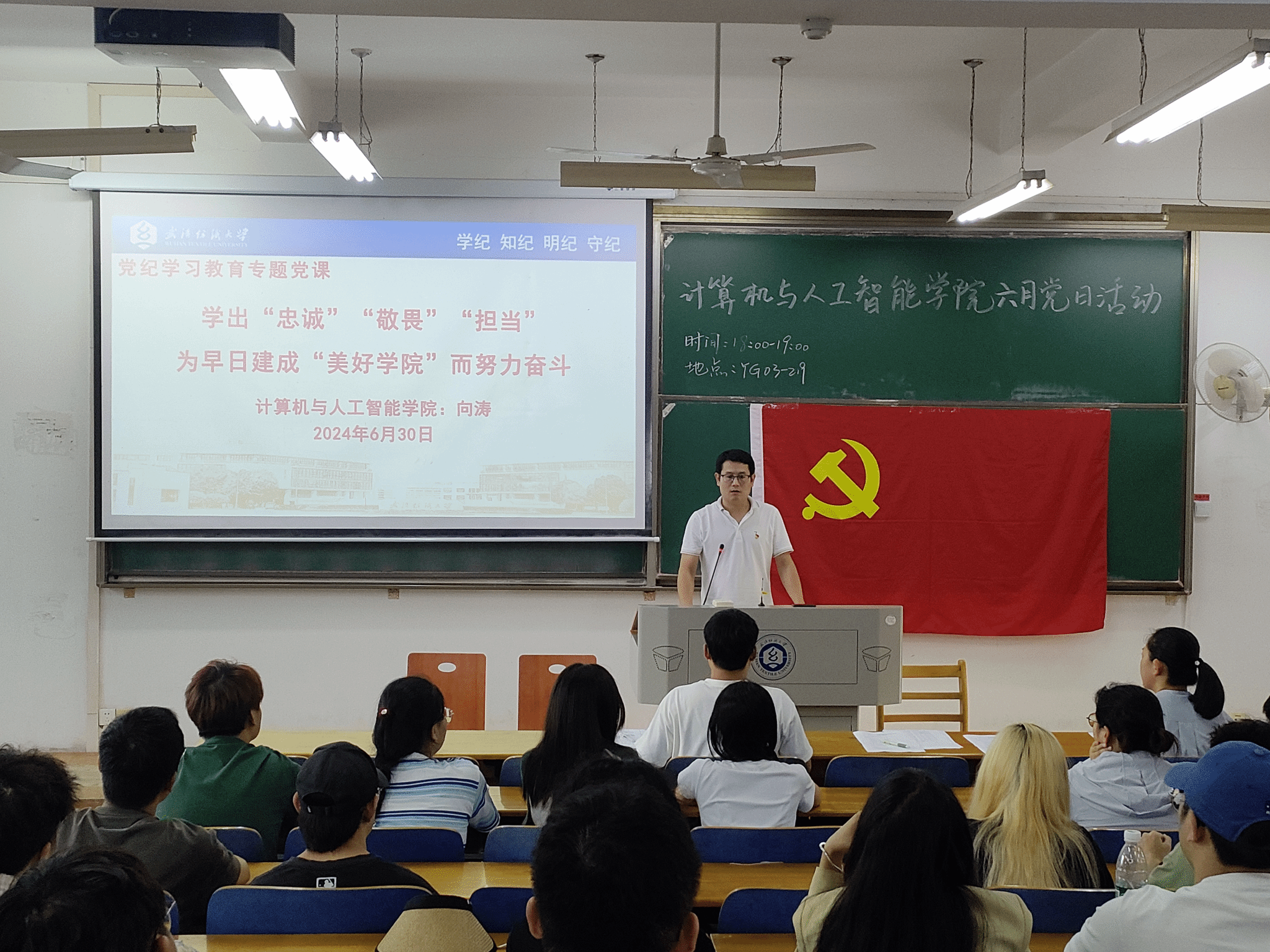 为深入学习贯彻习近平总书记关于党纪学习教育的重要讲话和重要指示精神,引导学生党员学纪、知纪、明纪、守纪,6月30日下午,男同 学生党支部于3号教学楼219教室开展党纪学习教育专题党课活动。会议由本科生第一党支部书记张栋主持,学院党委副书记向涛,辅导员廖龙、喻仪、余梦帆,全体学生党员共同参加。