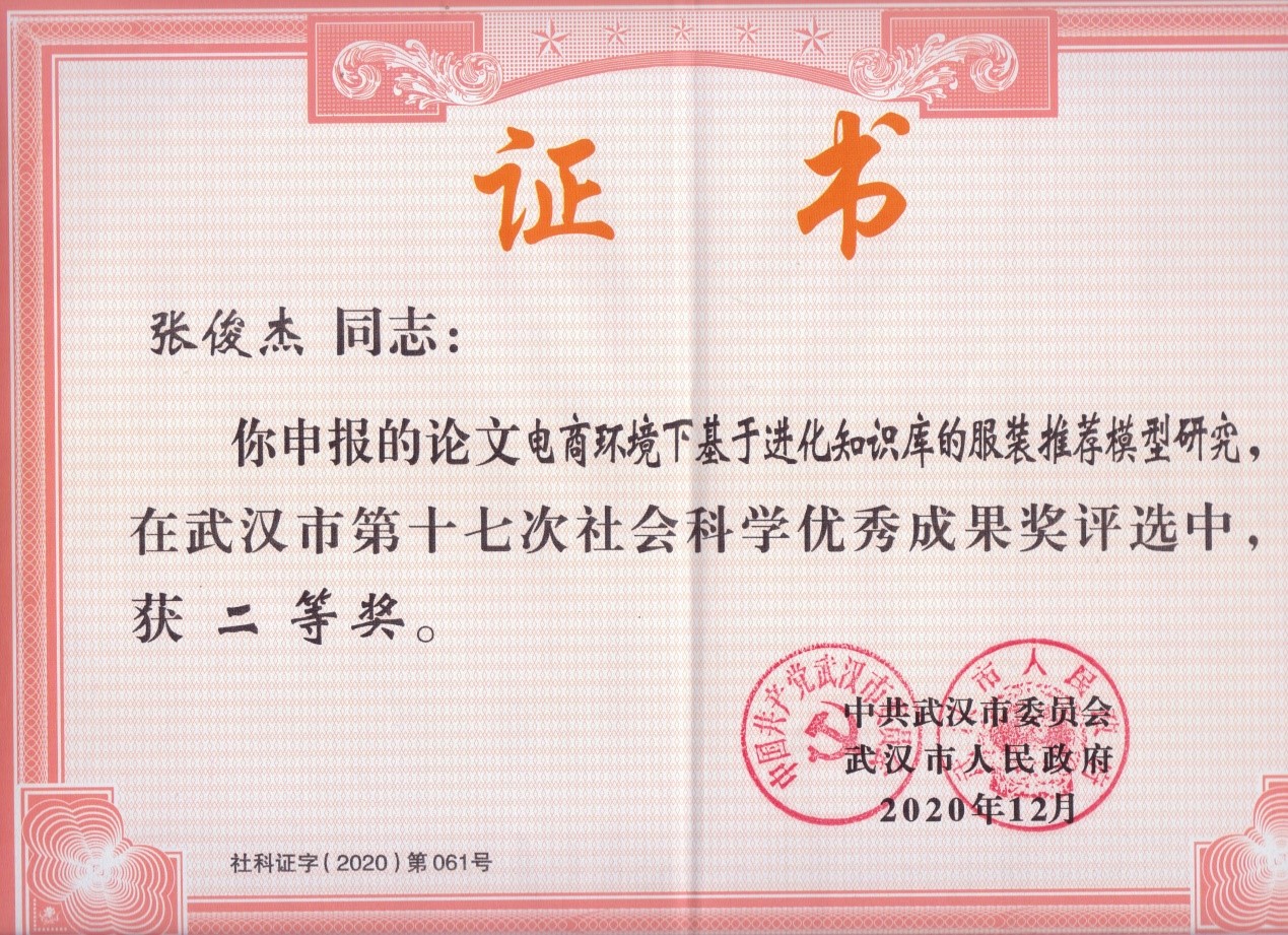 近日,在“武汉市第十七次社会科学优秀成果奖”颁奖大会上传来喜讯:男同 张俊杰老师的研究成果“电商环境下基于进化知识库的服装推荐模型研究”荣获二等奖。