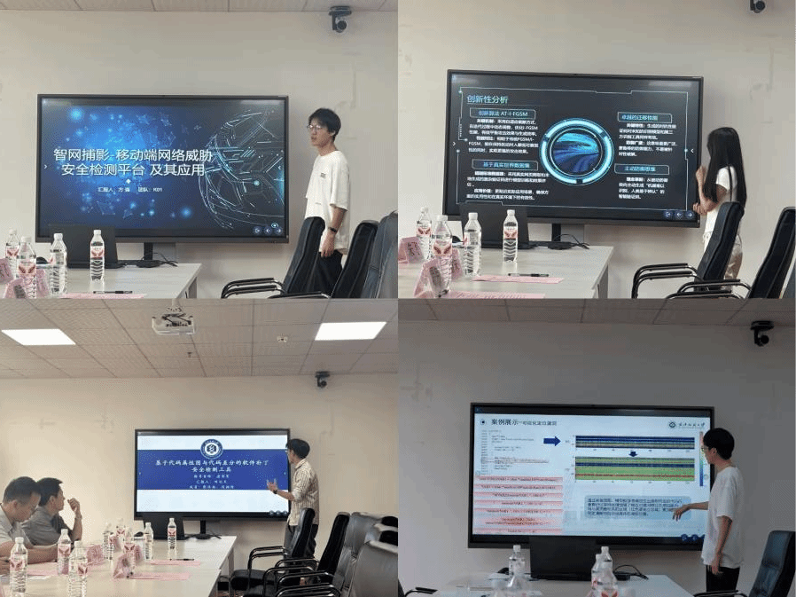 本次校内选拔赛选题涵盖了移动端安全防护、软件漏洞检测、人工智能安全等多个前沿领域。各参赛队伍精心备赛,从参赛作品的技术细节、创新价值和应用前景等方面进行了演示与讲解。在答辩现场,参赛选手们以扎实的研究成果展开激烈角逐。