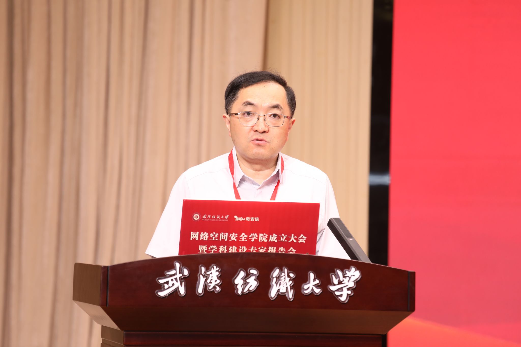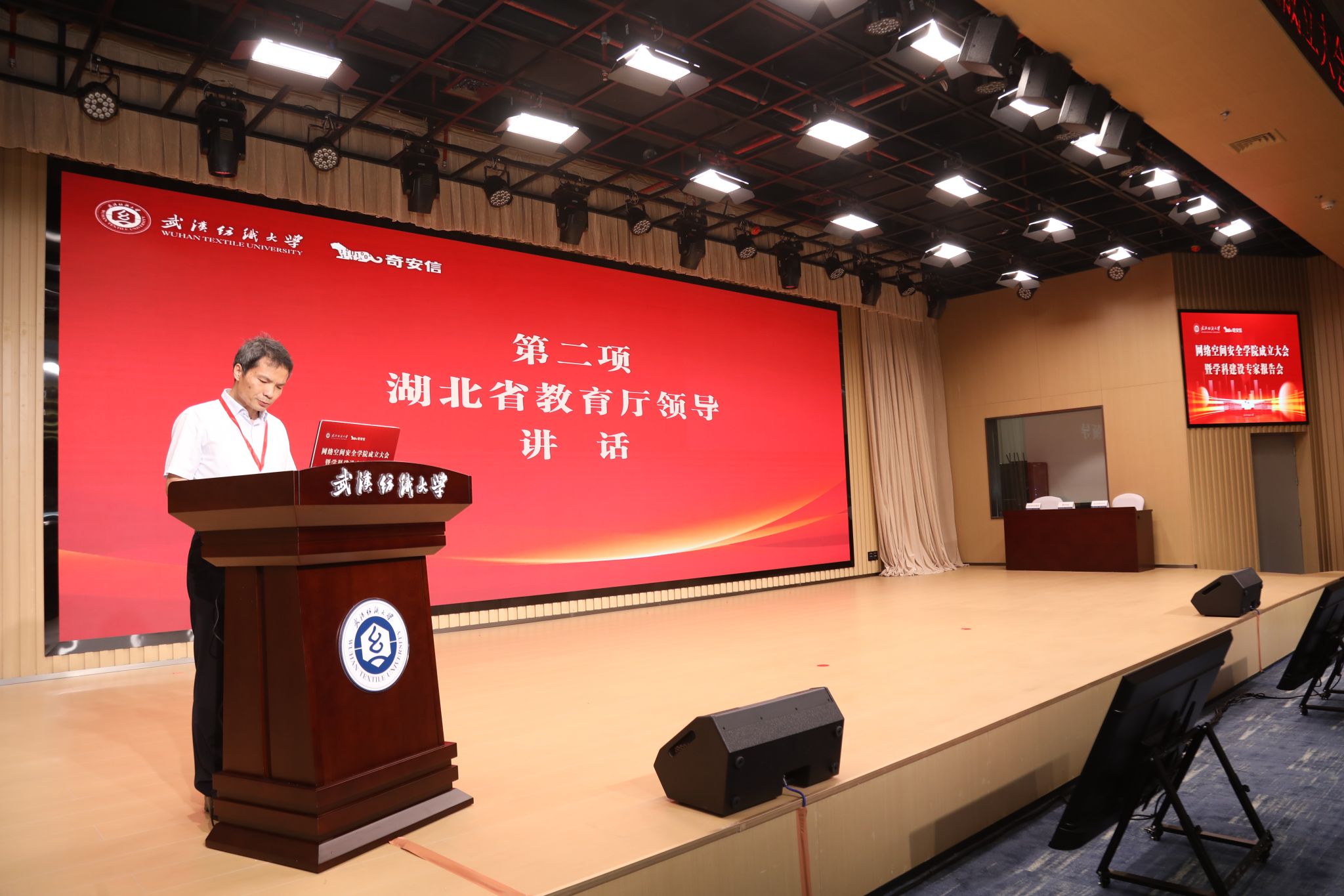 湖北省教育厅高教处二级调研员饶贵安在讲话中对学院成立给予肯定,认为其办学方向契合时代趋势、办学定位契合湖北发展需求。他期望学院以高起点、高标准、高质量为目标,紧密对接产业需求,深化教育教学改革,为湖北建设教育强省、科技强省输送更多高素质网络安全人才。