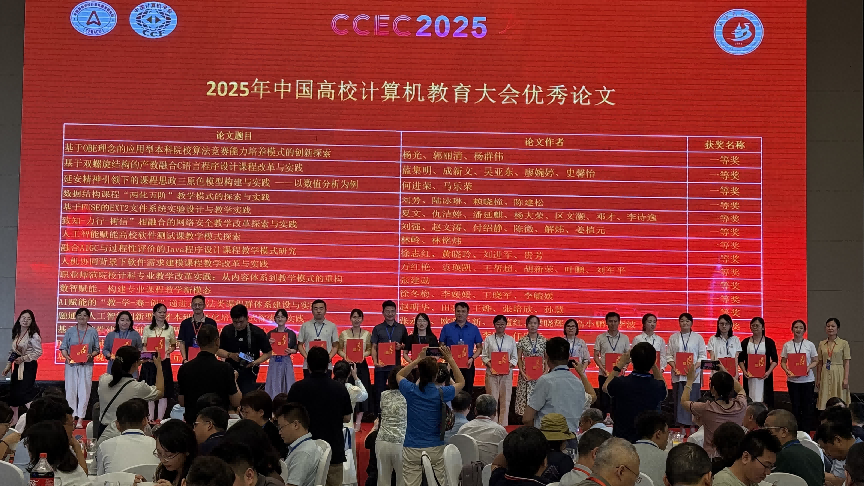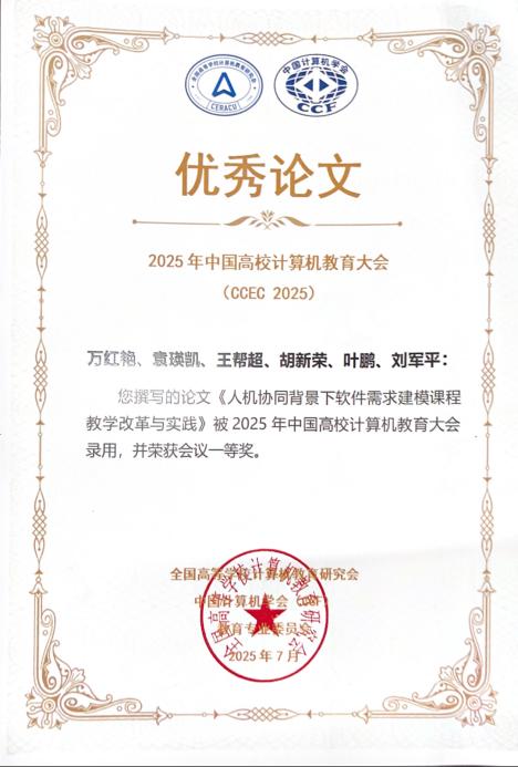 近日,在银川举办的2025年中国高校计算机教育大会(CCEC 2025)上,男同 胡新荣教授团队万红艳、王帮超、叶鹏、刘军平老师的研究成果《人机协同背景下软件需求建模课程教学改革与实践》在激烈评比中脱颖而出,荣获优秀论文一等奖,并推荐到《计算机教育》期刊出版。