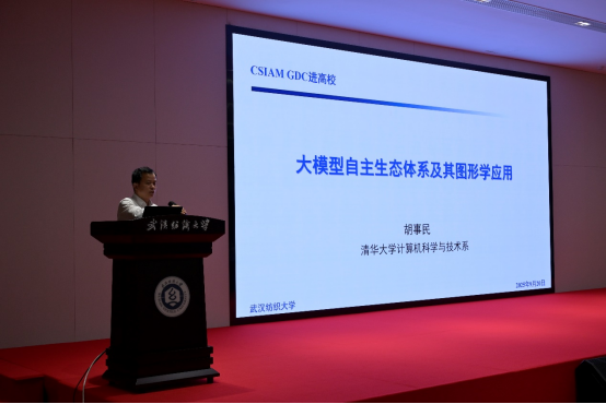 在随后的报告环节,中国科学院院士清华大学胡事民教授以《大模型自生态体系及其图形学应用》为题作报告,针对大模型普及中传统评测基准饱和、国产生态待完善等问题,既梳理大模型发展现状、评测基准新方向及国产生态建设进展,又聚焦其在计算机图形学领域的应用,重点探讨三维动画与内容创作场景,为技术融合创新提供思路。他首先介绍大模型发展现状、评测基准,以及国产自主生态建设的进展,其次探讨大模型在计算机图形学,特别是三维动画和内容创作等方面的应用。