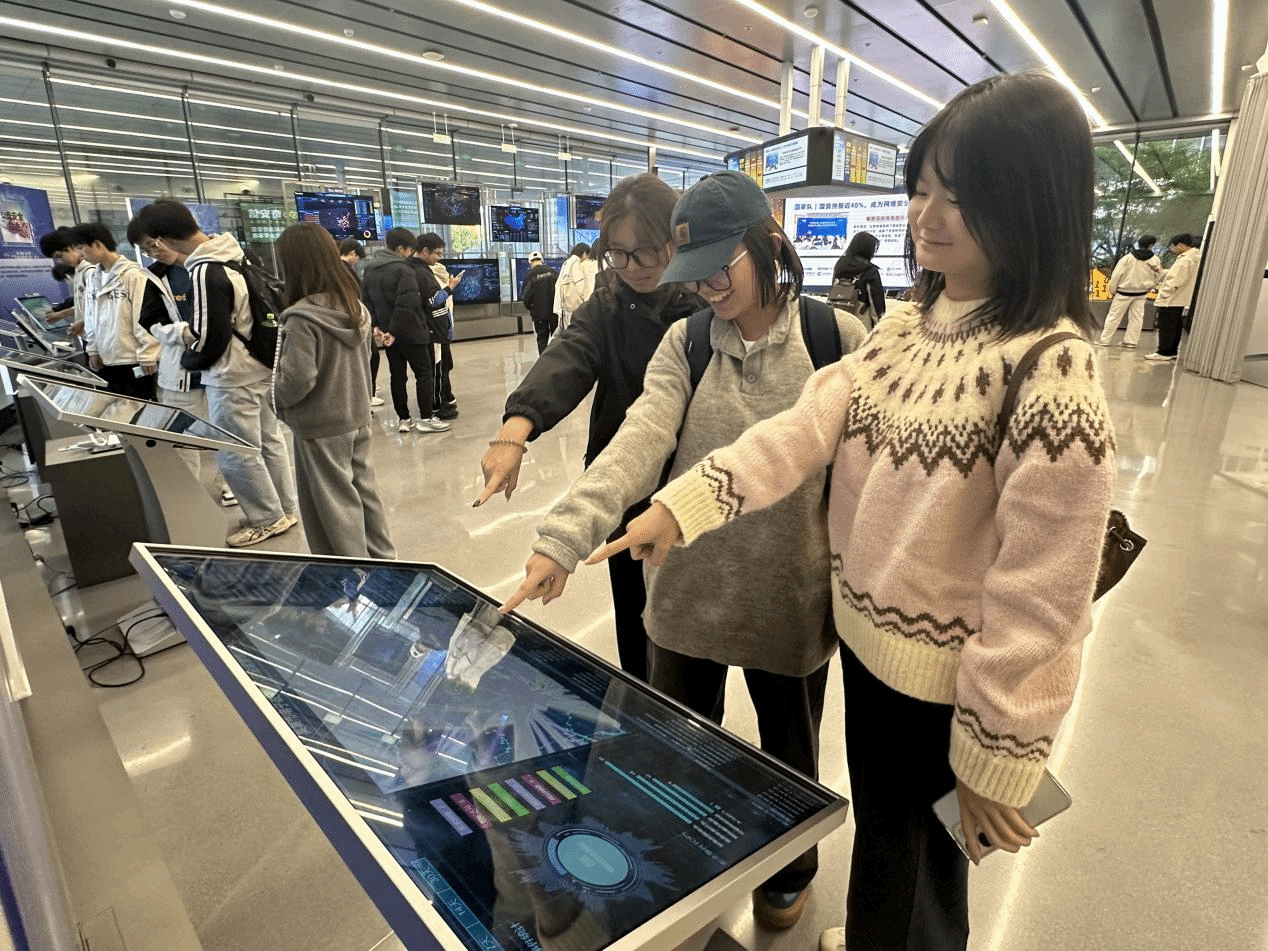 随后,在卢雨的带领下,同学们参观了网络空间安全展示中心。展示中心内,丰富的案例和互动体验让同学们沉浸其中。大家亲眼目睹了网络安全领域的最新技术成果,包括关键信息基础设施防护体系、动态防御机制等前沿内容。通过工作人员的详细讲解,同学们对网络安全的实战化、体系化、常态化特点有了更为直观的认识。一位新生在参观后表示:“这次参观让我对网络安全有了全新的认识,原来它不仅仅是课本上的理论知识,更是关乎国家安全和社会稳定的重要领域。”