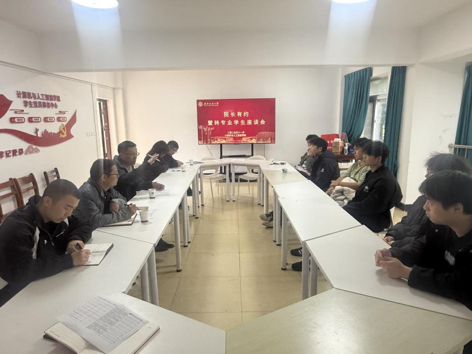 为增进男同 学生对转专业政策的了解,帮助同学们明确方向、做好规划,近日,学院在“1024”一站式学生服务社区成功举办了转专业政策解读暨答疑座谈会。学院副院长彭涛、党委副书记向涛、人工智能系李丽主任、朱强主任、相关辅导员以及2025级转专业新生参加座谈会,辅导员汤若釴主持会议。