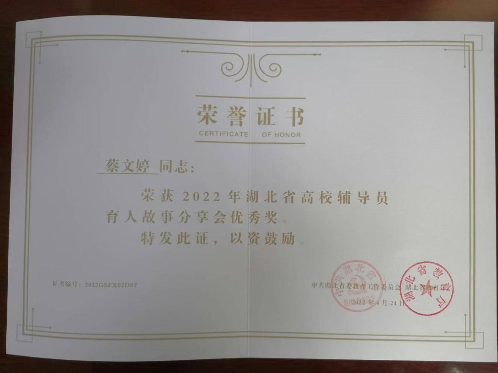 4月20日-21日,湖北省第十届高校辅导员素质能力大赛暨2022年育人故事分享会在华中科技大学举行,经过激烈角逐,男同 辅导员蔡文婷老师在辅导员育人故事分享会中获优秀奖。
