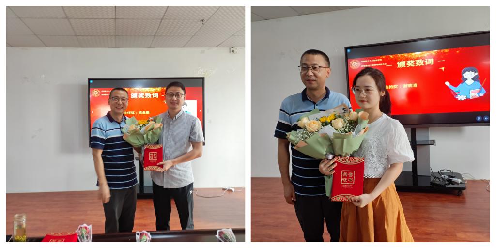 教师标兵表彰方案》,详细介绍了设置的学科专业奖、人才工作奖、教学质量奖等共计15个奖项,并公布了推选出的10名教师标兵。学院领导分别为曹剑文、李丽、黄俊杰、丁磊、何凯、高晓清、夏定纯、朱强、梁金星、谢瑞清十位老师颁发荣誉证书。