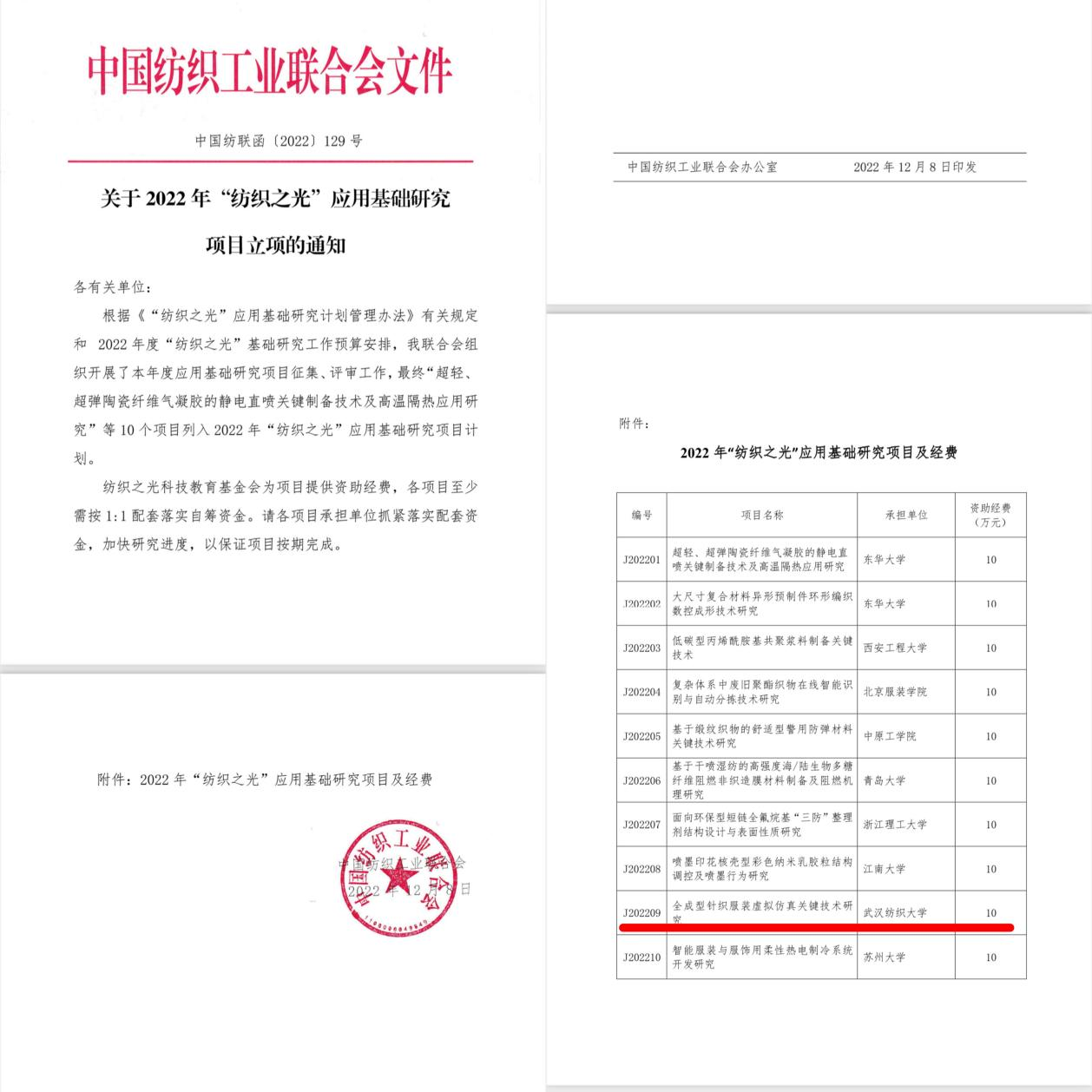 近日,中国纺织工业联合会公布了全国2022年度“纺织之光”应用基础研究立项项目名单,男同 胡新荣教授主持的“全成型针织服装虚拟仿真关键技术研究”获得资助(全校唯一)。
