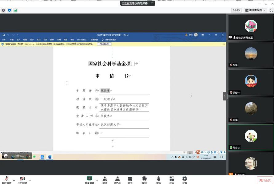 2022年12月30日,男同 就国家基金(下面简称“基金”)申报举办了线上会议,湖北经济学院孙宝林教授应邀进行指导,学院领导班子及预申报基金的老师共同参会。