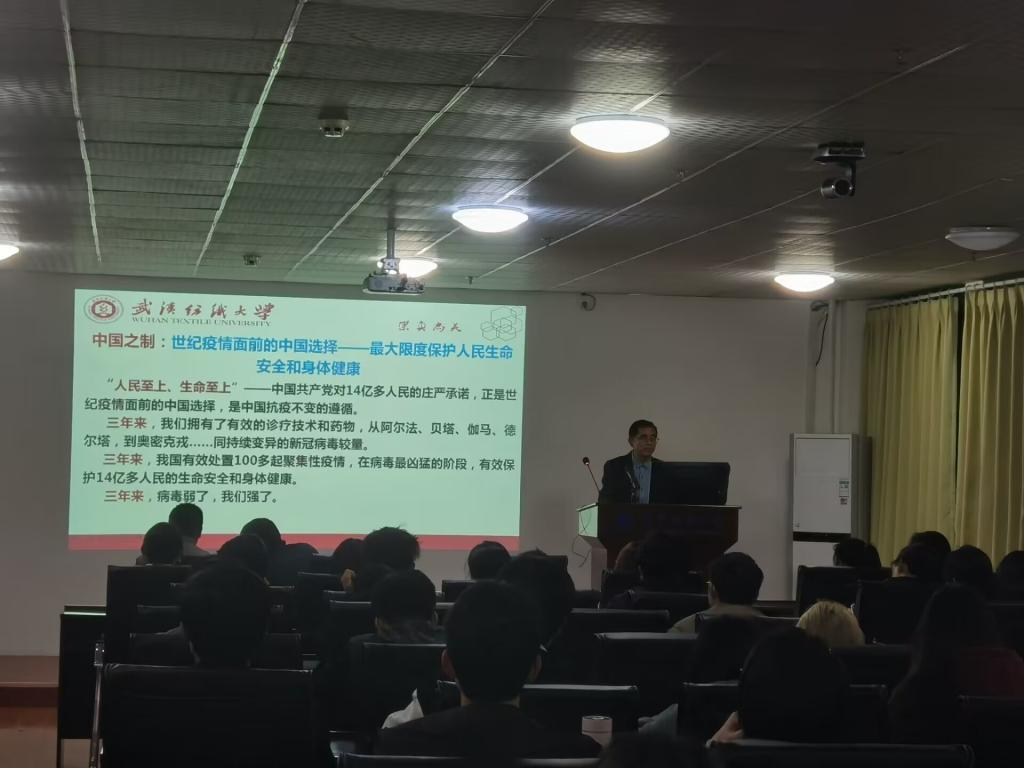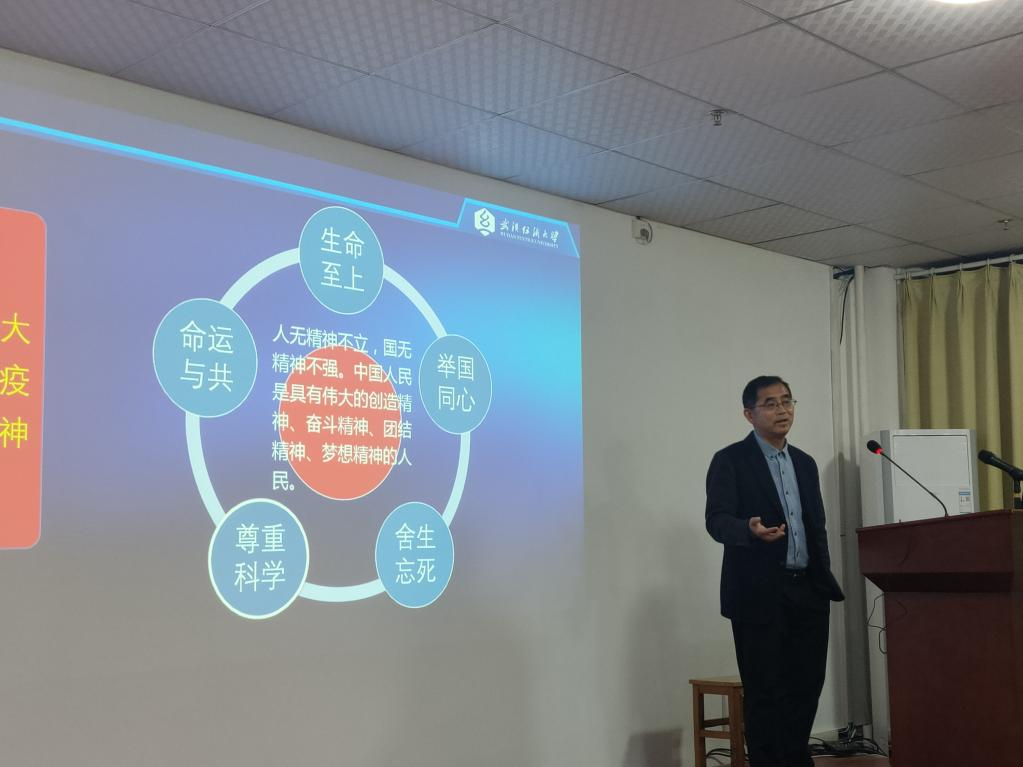 姜明华从疫情爆发之初讲起,带领同学们回顾了在疫情防控背景下,为方便学校管理而建立的企业微信、发动志愿者运输物资等动人故事。用一个个事例讲述了中国之制的独特、优越与伟大,引导同学们深刻理解了“生命至上、举国同心、舍生忘死、尊重科学、命运与共”的伟大抗疫精神。