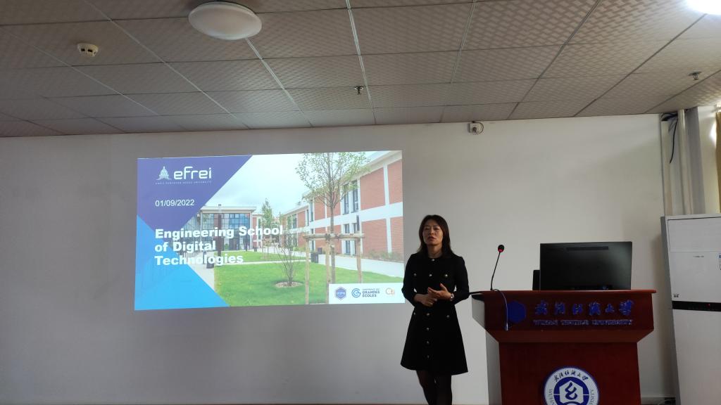 Xinghua以视频短片的形式,全方位展示了法国电子与计算机信息通用工程师学院(简称EFREI)的校园全貌景观、学生社团活动和大数据专业简介,为现场师生初步勾勒了学校的大致轮廓。她指出电子与计算机信息通用工程师学院是全法培养信息及电子工程师的标志性学校,设有法语授课专业和英语授课专业,介绍了法国政府对国外留学生的优待政策,对有意向前往留学的同学表示了欢迎。