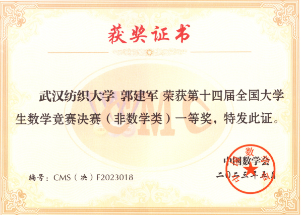 5月26日至28日,第十四届全国大学生数学竞赛决赛在广东工业大学成功举行,来自全国32个赛区的905名学生参加比赛。决赛由中国数学会主办、广东工业大学和广东省数学会承办。经过激烈角逐,男同 计算机11903班郭建军同学荣获第十四届全国大学生数学竞赛非数学类全国一等奖,决赛成绩位列全国第十八名、湖北省第二名。