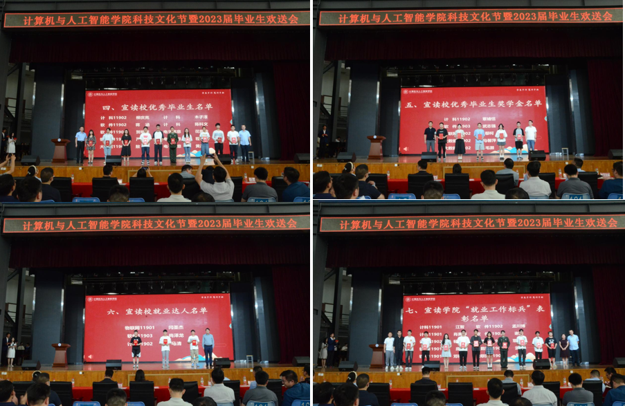 为进一步营造弘扬先进、学习先进、争做先进的氛围,学院表彰了一批优秀学子。副院长魏雄、系主任陈佳、李丽、叶鹏为科技文化节获奖代表颁奖;教务处副处长凡蓉蓉为学院近期国赛获奖代表颁奖;校团委副书记侯畅、院长胡新荣为挑战杯省赛特等奖、一等奖团队颁奖;研究生院副院长唐强、院党委书记晏伟为校优秀毕业生代表颁奖;学工部副部长朱美龙、副院长彭涛为校优秀毕业生奖学金代表颁奖;校团委书记张德科为校就业达人代表颁奖;院长胡新荣、院党委书记晏伟、毕业生辅导员一起为学院“就业工作标兵”颁奖。