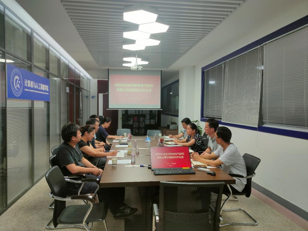 7月9日上午,武汉新电电气股份有限公司邱凌总经理一行5人,就校企合作、产教融合来男同 进行考察座谈。学院院长胡新荣、副院长彭涛出席会议,学院产学研合作办公室刘军平主任和李敏老师参加了座谈。