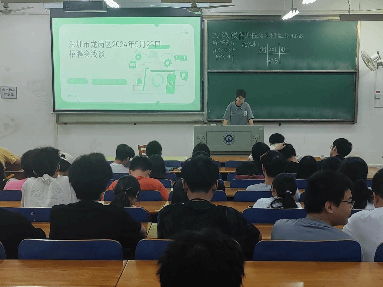 随后,2022级软件工程专业的代佳妙同学与同学们分享了她在深圳市龙岗招聘会上的经历和感受。她首先介绍了几家与我们相关专业相关的公司,包括他们的招聘要求和薪资待遇等情况。她指出,总体来说,本科生的薪资水平相对较低,而考研后的薪资待遇普遍较高。此外,她特别强调了英语能力、口才和交流能力以及综合能力的重要性。最后,她为大家提供了一些新的思路,认为我们不一定非得从事程序员这个职业,还可以考虑公务员考试,或者选择管理等其他职业道路。她以招聘会上的两个培训机构的招聘为例,鼓励大家多方面关注就业信息,给自己更多的选择机会。